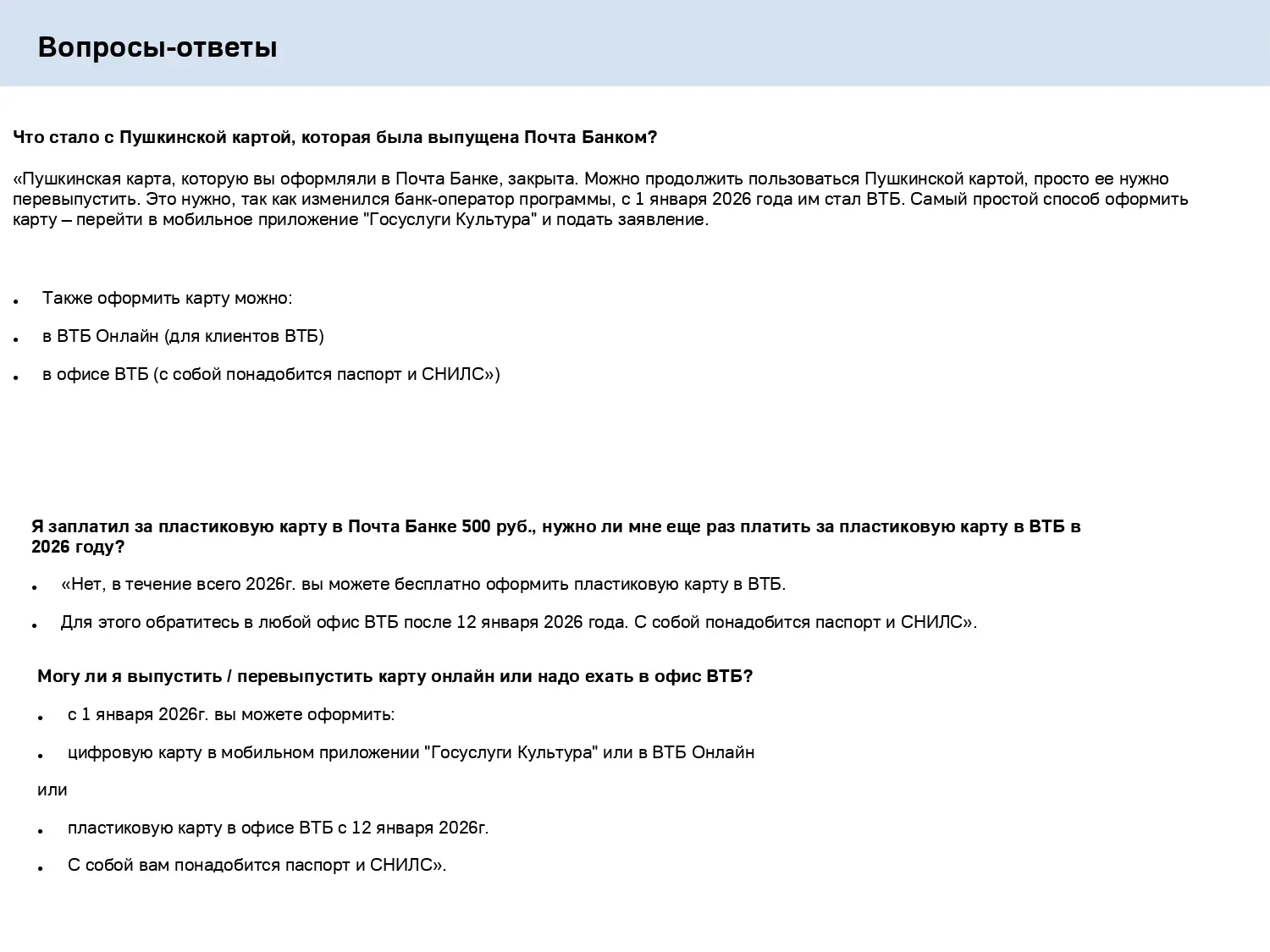 До 31 декабря 2025 года оператором «Пушкинской карты» является Почта Банк. С 1 января 2026 года выпускать и обслуживать карту будет банк ВТБ.