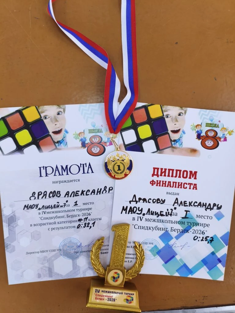 Сегодня на базе МБОУ СОШ 8 состоялся IV межшкольный турнир по "Спидкубингу". Наш лицей представляла команда в составе: Дрясов Александр, Зебницкий Никита (10б кл.), Токмаков Александр (10А кл.). По итогам турнира Дрясов Александр занял I место в возрастной категории 10-11 кл. С результатом 0:32,1. И завоевал I место в финале турнира с результатом 0:25,7. Руководитель команды Рыбалко Е. Ю.