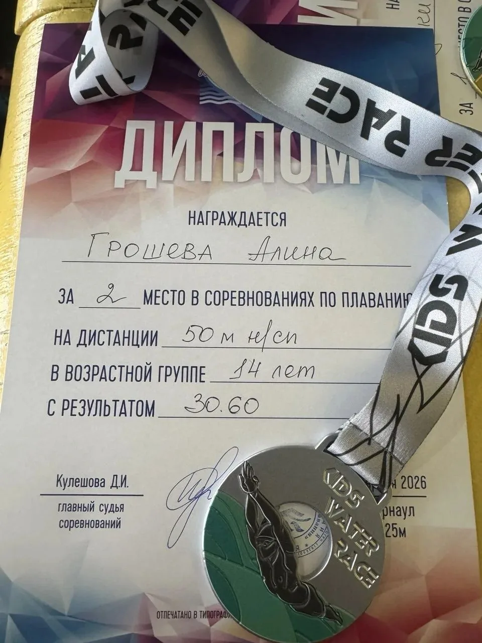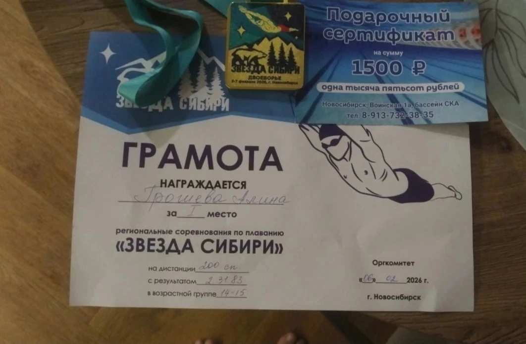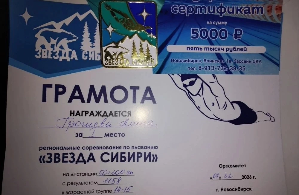 Поздравляем Грошеву Алину, занявшую 2 место в соревнованиях по плаванию "Дети воды".