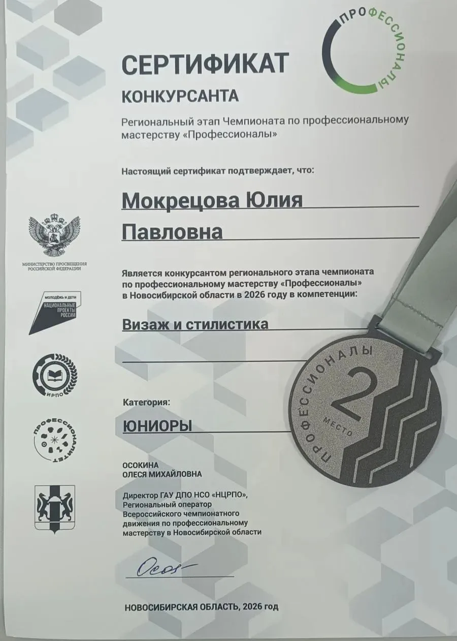 Поздравление с победой на Чемпионате "Профессионалы" Мокрецову Юлию и её наставника эксперта Шалыгину Ирину Викторовну, которые заняли заслуженное 2 место на престижном Чемпионате "Профессионалы" в номинации "Визаж и стилистика"! Их талант, креативность и профессионализм получили высокую оценку жюри и зрителей. Желаем дальнейших успехов, вдохновения и новых побед!