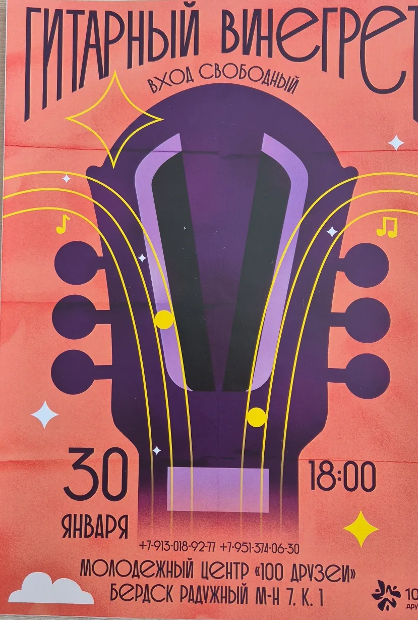 Дорогие родители, обучающиеся! Молодежный центр "100 Друзей" приглашает послушать выступление гитаристов г.Бердска. Приходите 30 января в 18.00.