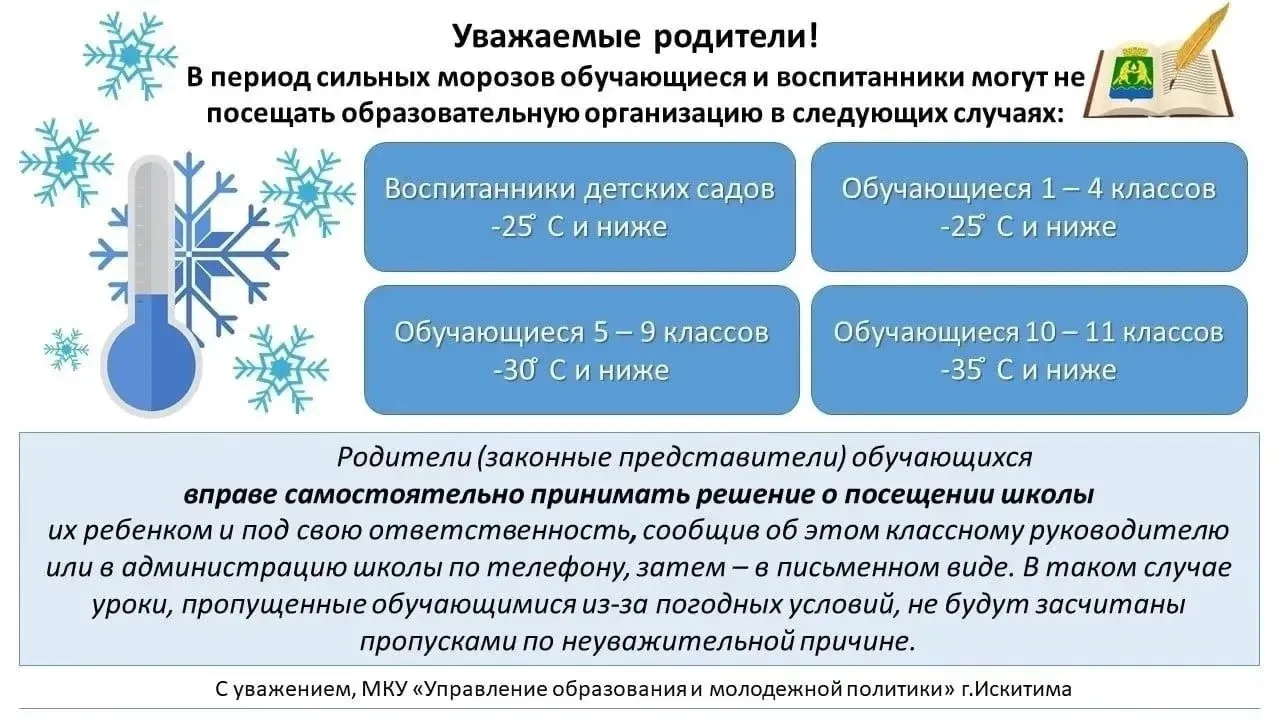 🥶В период сильных морозов воспитанники и обучающиеся могут не посещать образовательные организации по следующим возрастным группам: