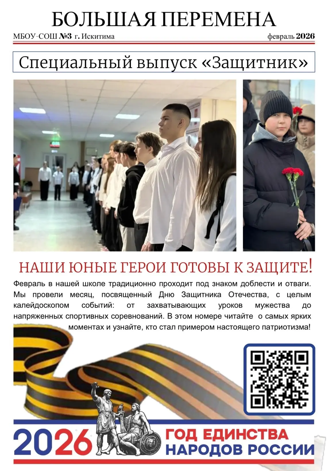 Ура! Вышел новый выпуск нашей школьной газеты «Большая перемена»! 🎉 Этот номер особенный — спецвыпуск «Защитник», посвященный мужеству, силе духа и нашим героям. 🛡️🎖️
