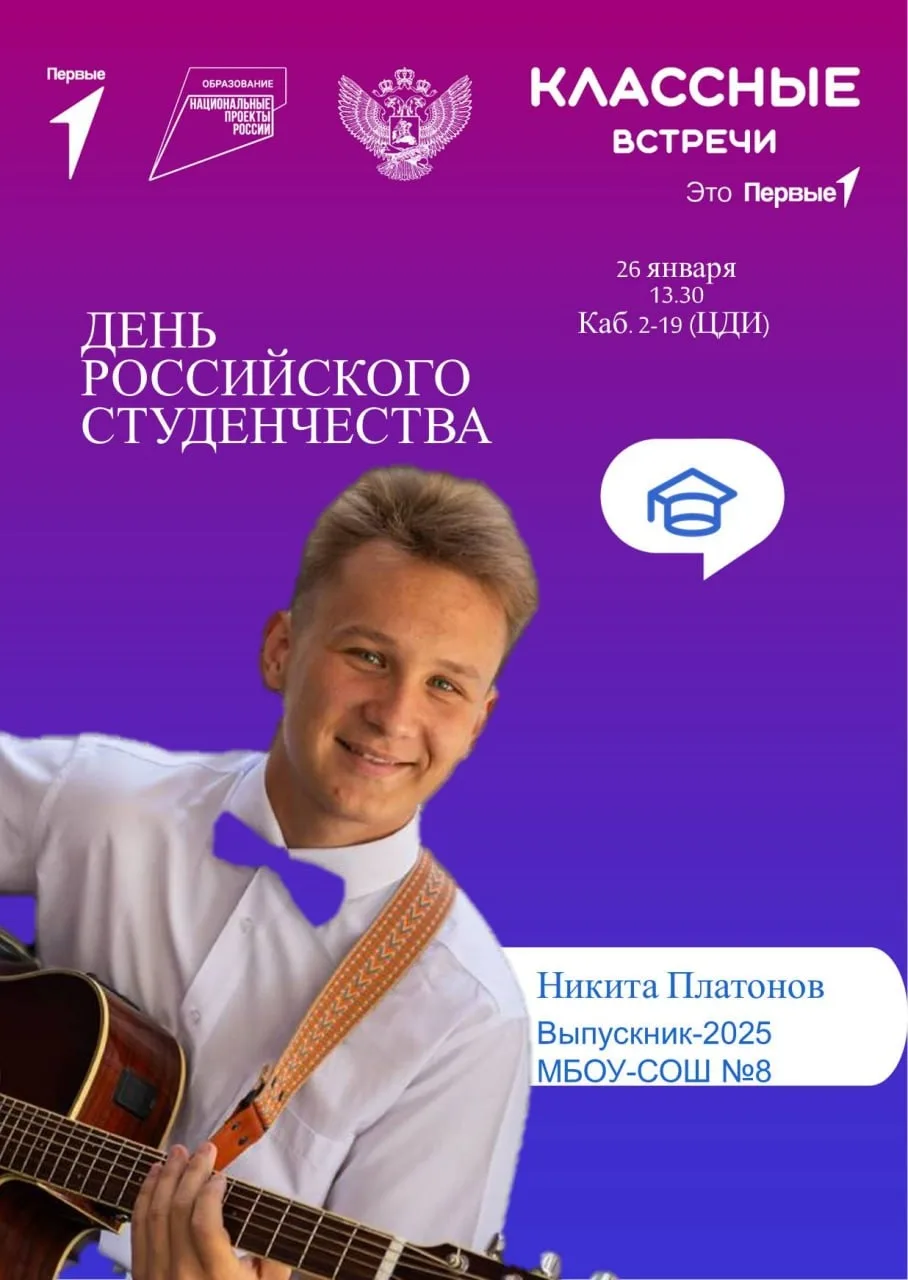 🗓 26 января 2026 года в 13:30 в кабинете 2-19 ЦДИ состоится классная встреча с выпускником нашей школы — Платоновым Никитой. Встреча приурочена ко Дню российского студенчества.