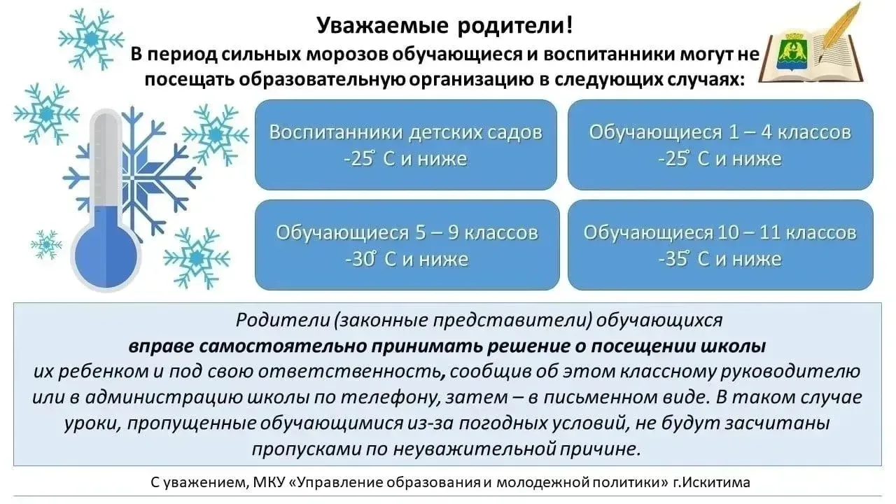 🔅При принятии решения о непосещении образовательного учреждения родителям необходимо учитывать сопутствующие факторы (направление и силу ветра, расстояние от места жительства до образовательного учреждения, переносимость ребенком пониженных температур и т.п.). В случае принятия решения о посещении образовательной организации в дни с неблагоприятными погодными условиями необходимо обеспечить сопровождение учащихся начальных классов в школу и обратно домой.