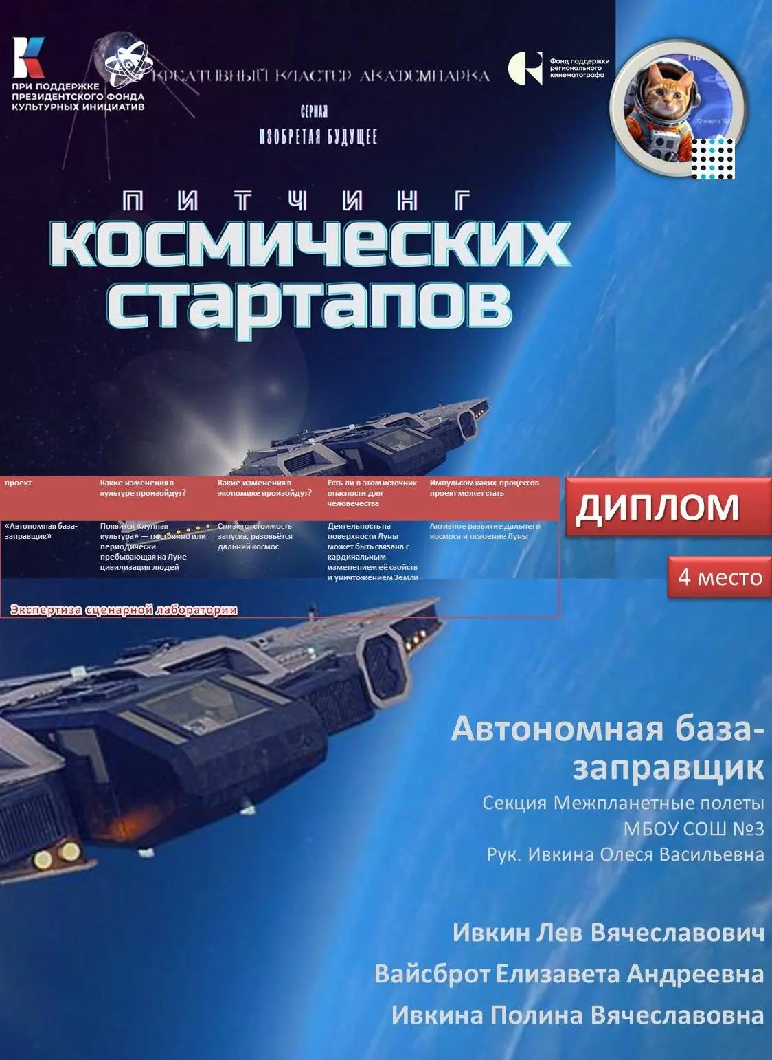 💫 Команды демонстрировали презентации, видеоролики, прототипы своих разработок. По итогам конкурса команда МБОУ СОШ №3 в составе: Ивкин Лев 7Б, Вайсброт Елизавета 7Б, Ивкина Полина 8И заняли почетное 4 место (из 16 лучших команд) с проектом «Автономная база-заправщик: стартуй с Земли и дозаправься на Луне».