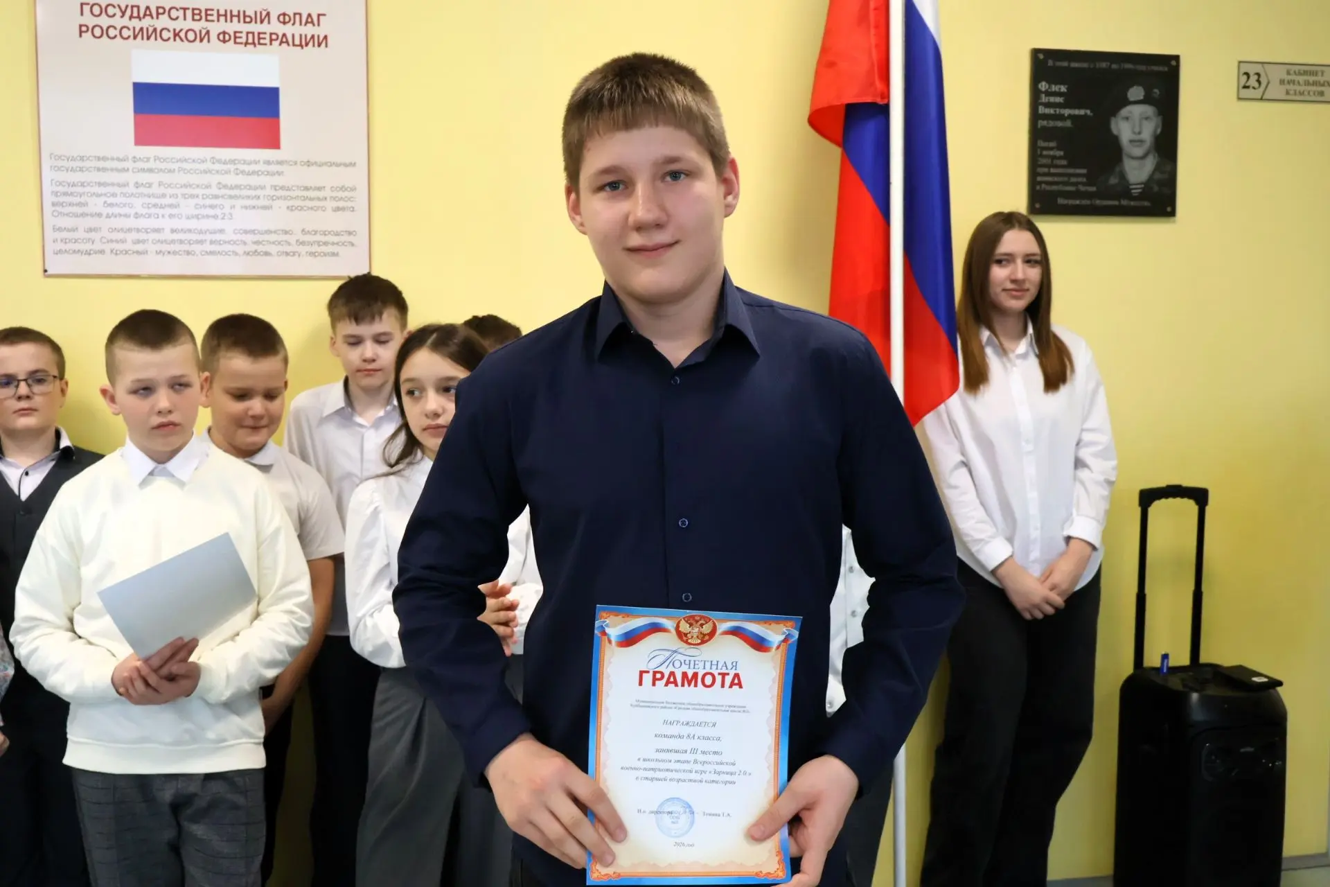 Право поднять флаг предоставилось капитану команды - победителя муниципального этапа регионального проекта "Спортивный фестиваль" по дисциплине "футбол", обучающемуся 11Б класса Мамичеву Льву.