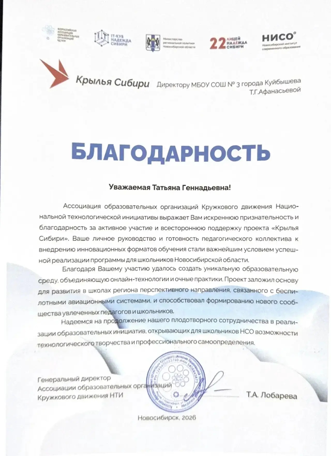 За активное участие в проекте «Крылья Сибири» была объявлена благодарность коллективу МБОУ СОШ №3!✨