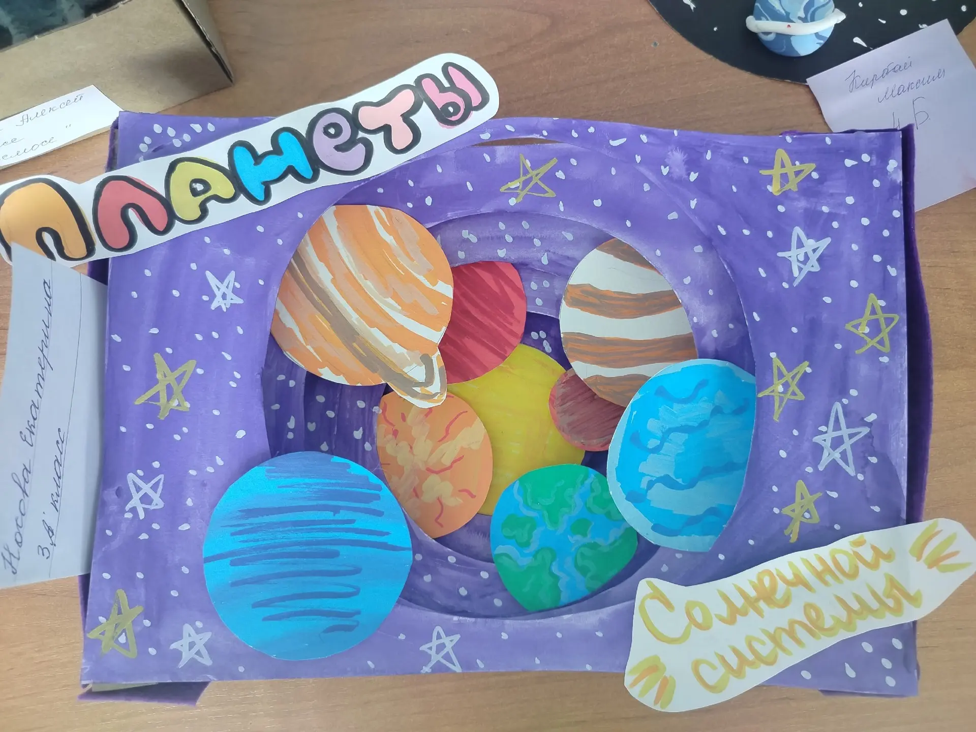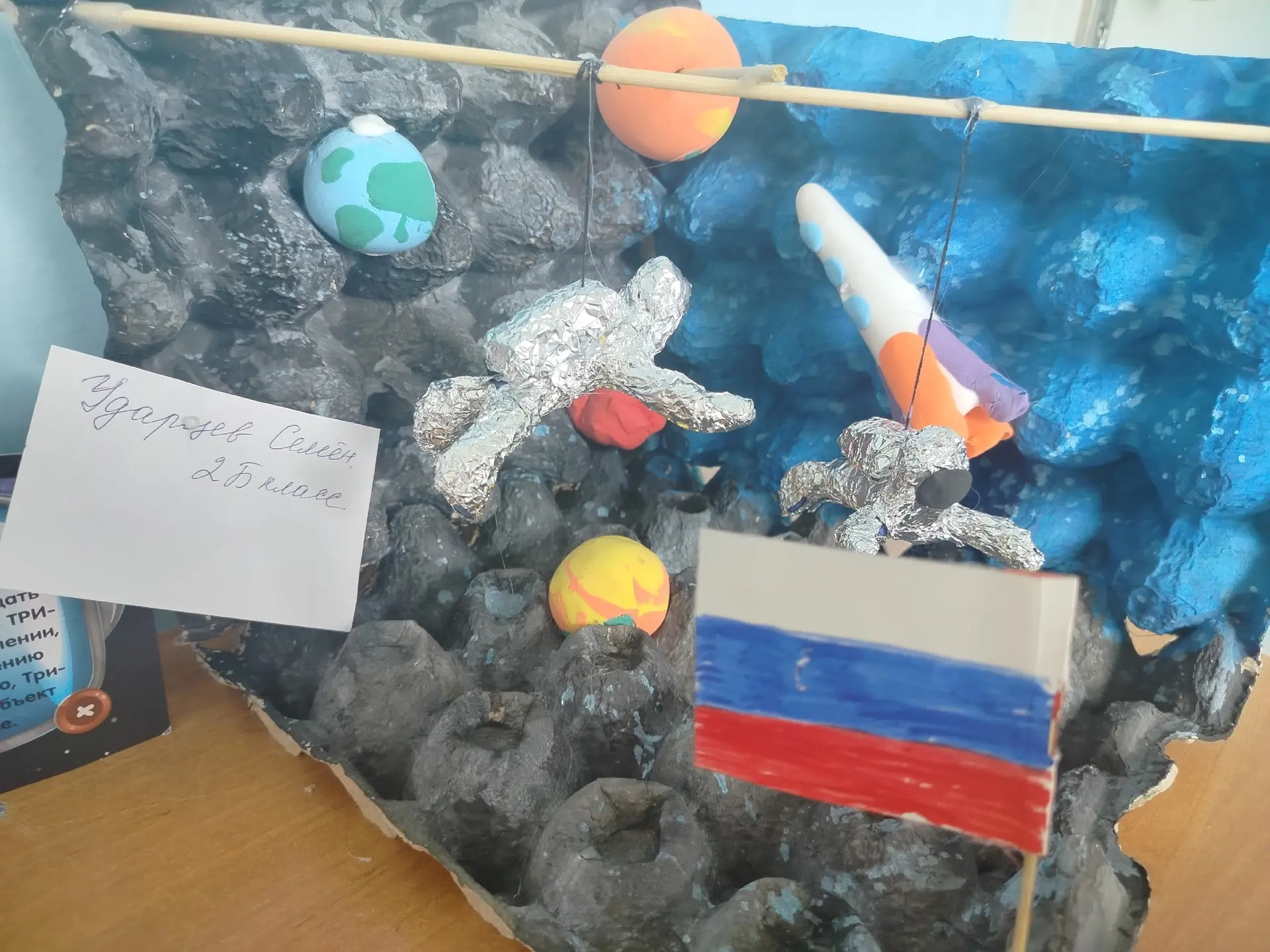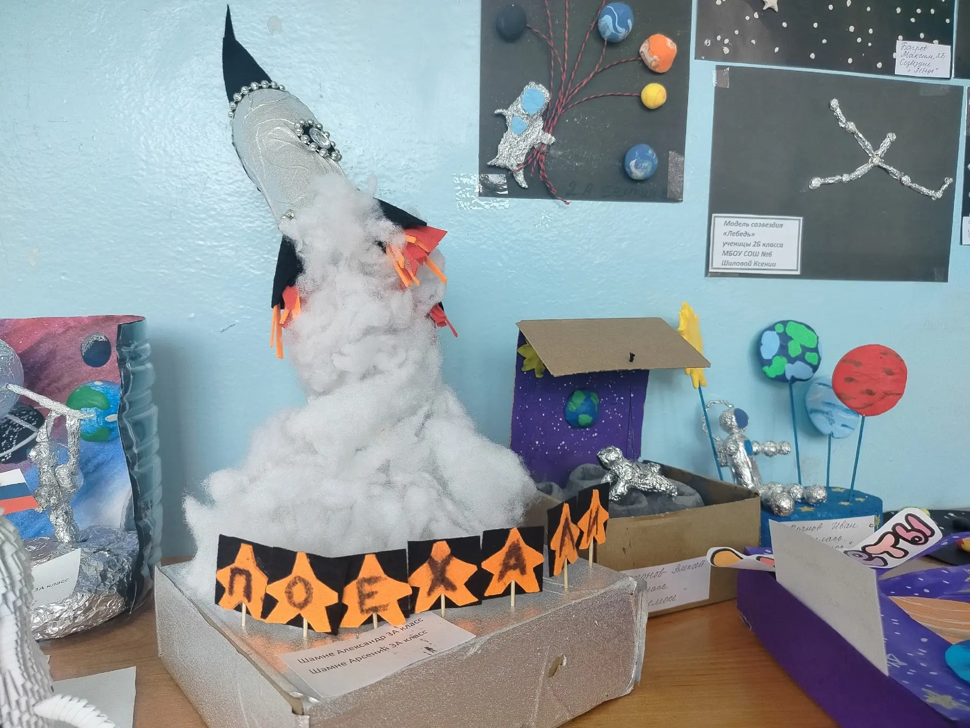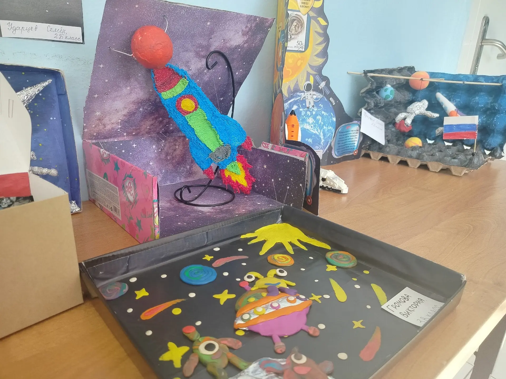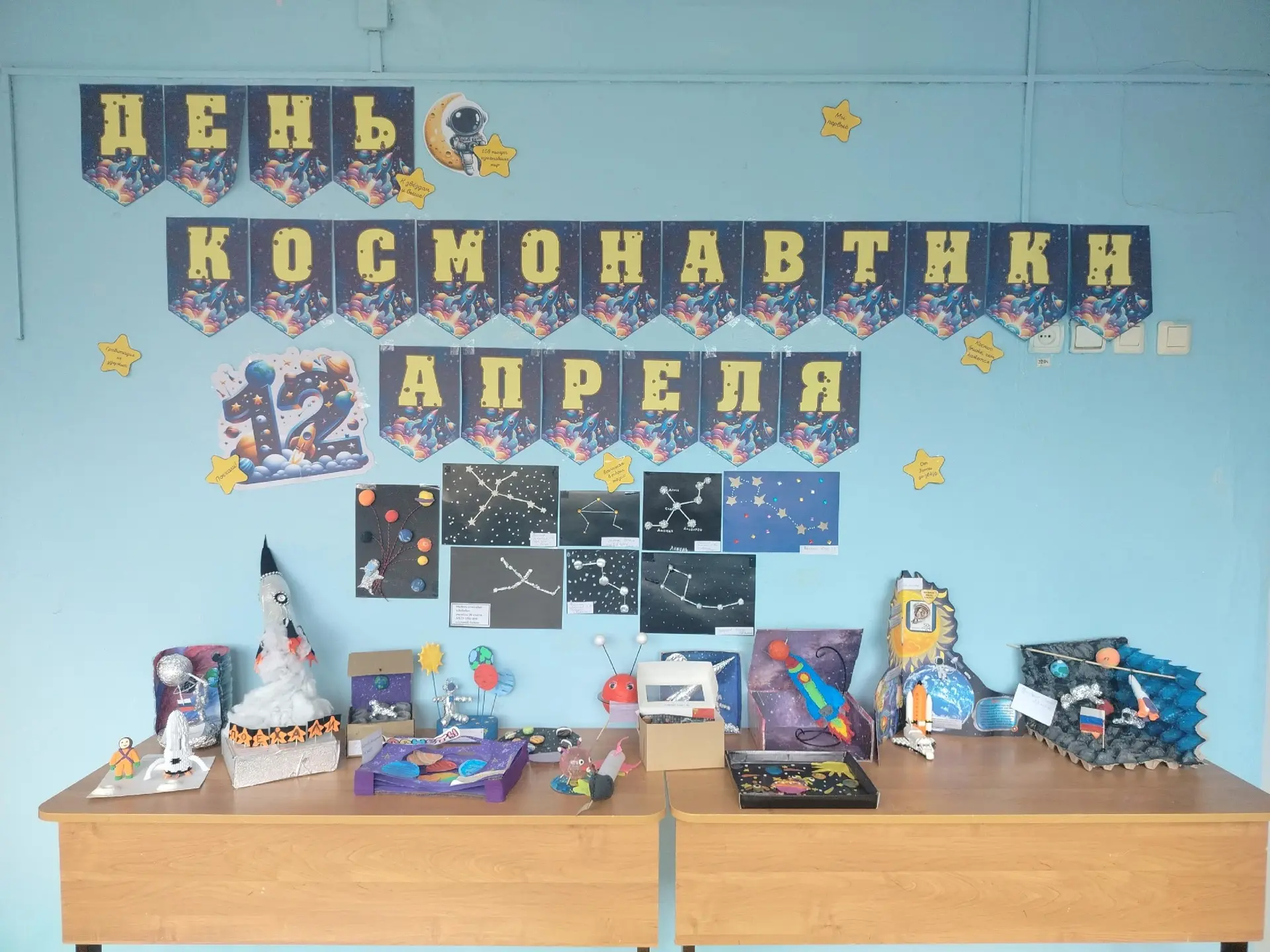 Для младших школьников была организована выставка декоративно-прикладного творчества «65 лет триумфа» 🎨. Ребята представили работы на космическую тематику: модели ракет 🚀, изображения планет и звёздных систем 🌟, сюжеты о жизни в далёких галактиках 🌌.