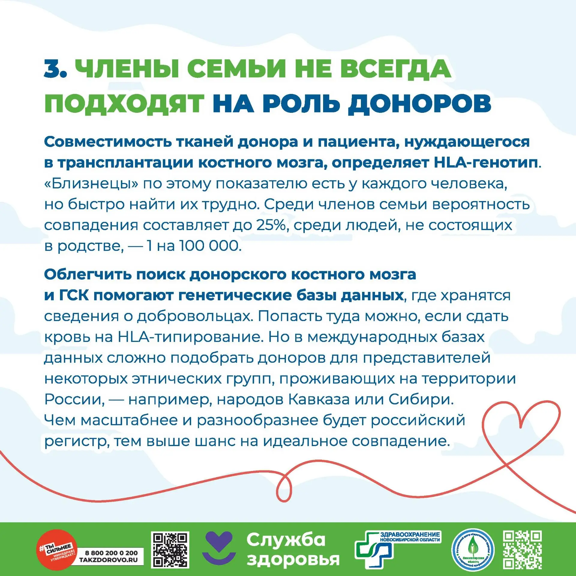Во-первых, сложно найти подходящего человека. Донора костного мозга ищут по HLA-фенотипу, но даже родственники подходят по нему на 25%. У донора должна быть максимальная тканевая совместимость с пациентом: гены, отвечающие за узнавание клеток иммунной системой, должны быть одинаковыми или почти одинаковыми. Научно не доказано, что потенциальный «генетический близнец» должен быть родственником пациента.