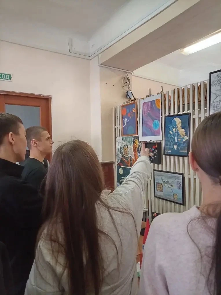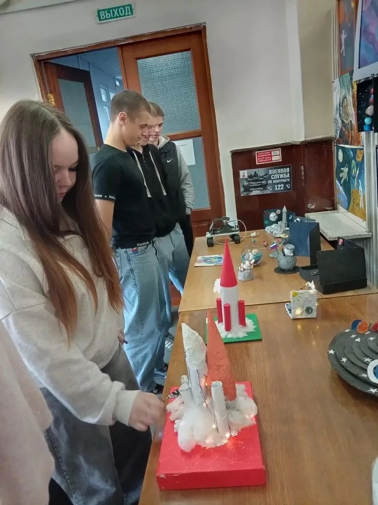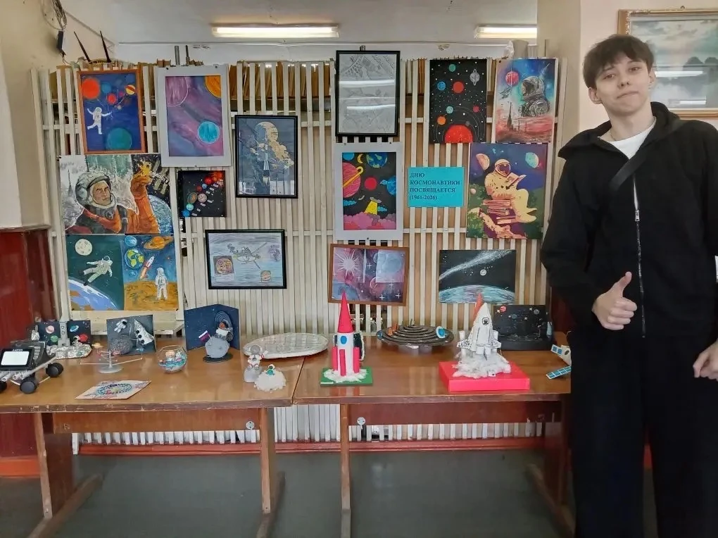 🎨 Экспозиция творческих работ студентов 1 курса — рисунки, поделки, муляжи, созданные юными талантами специально к 65-летию первого полёта человека в космос. Каждая работа — это взгляд на подвиг Юрия Гагарина глазами нового поколения.