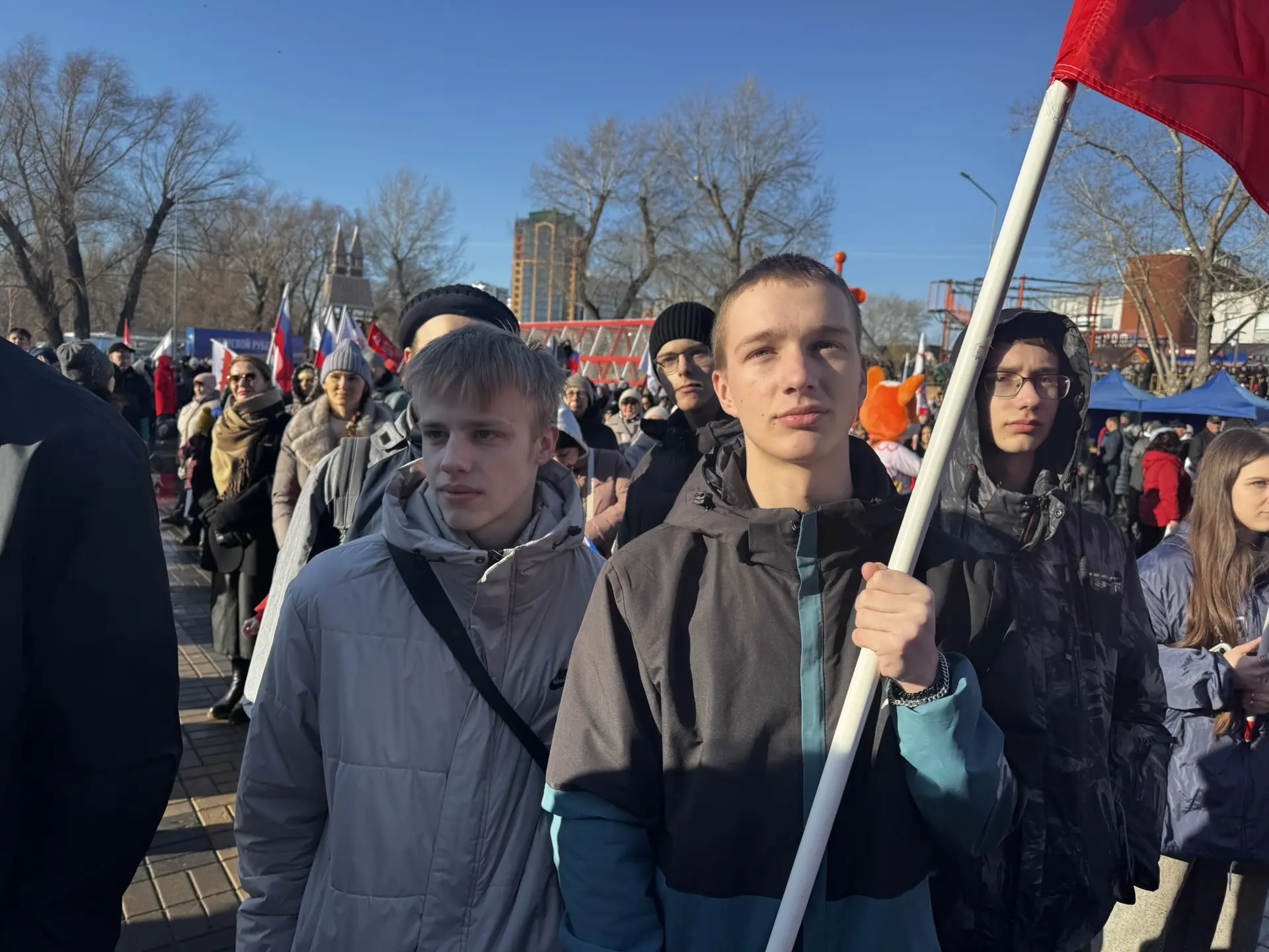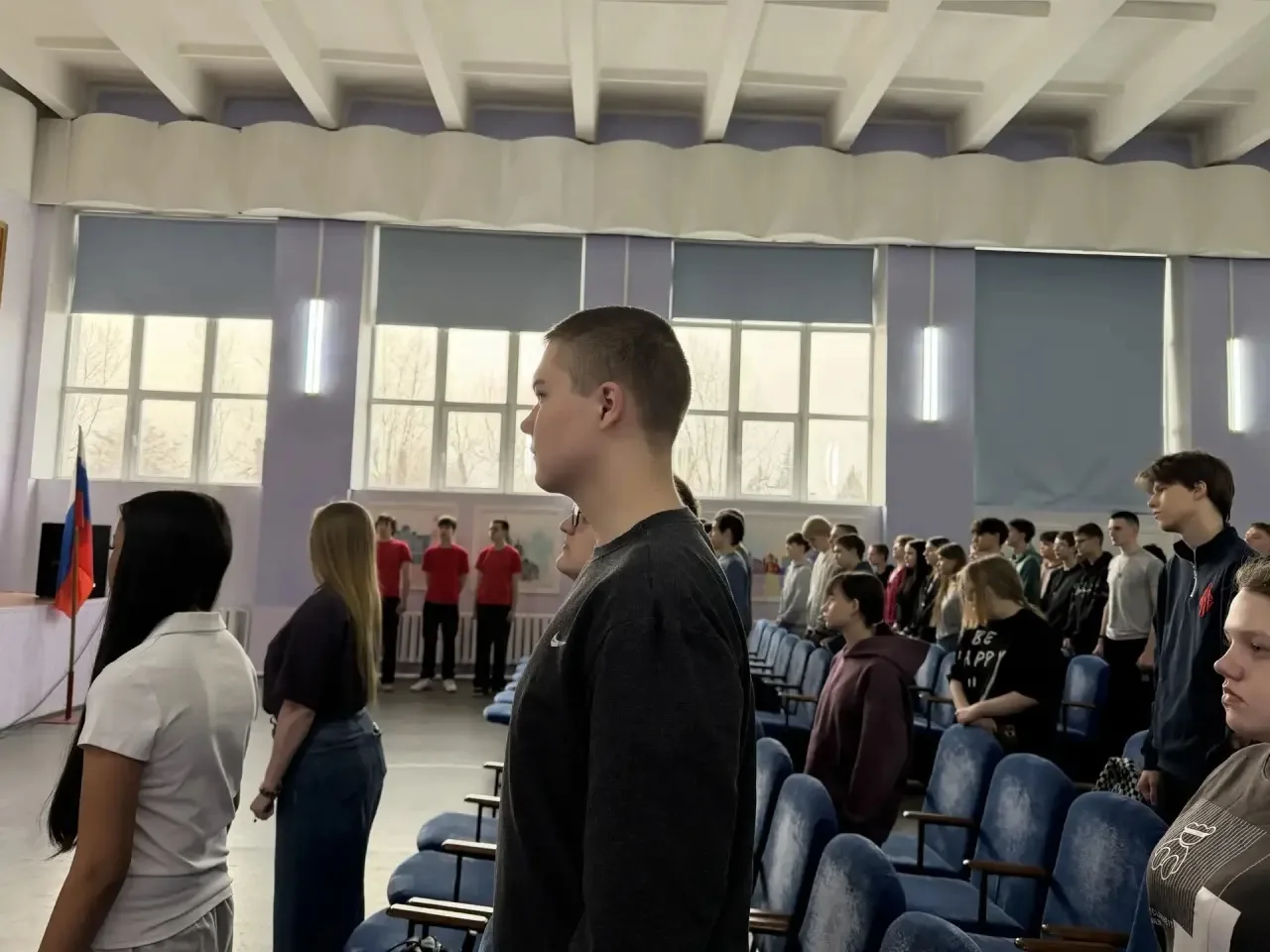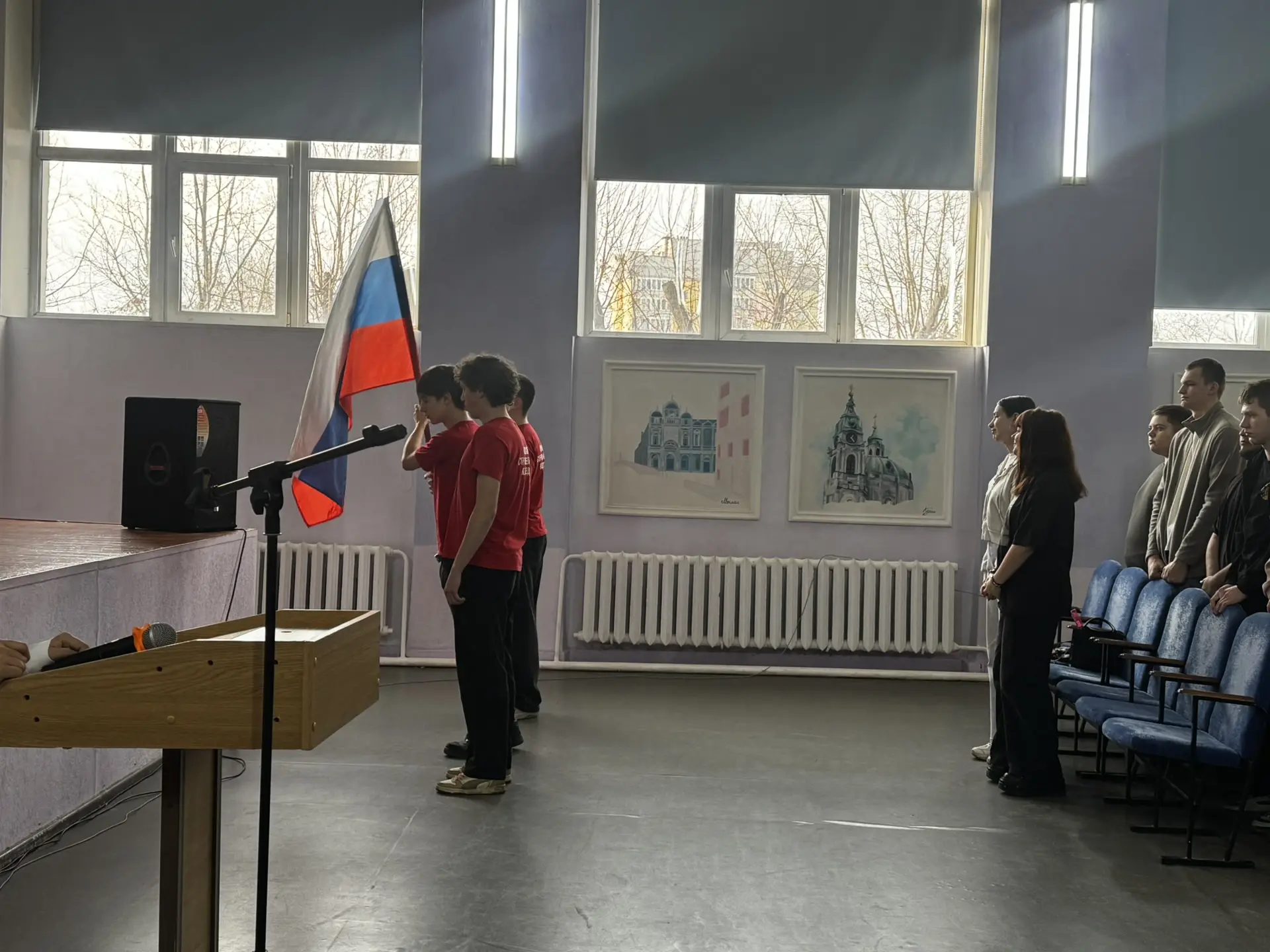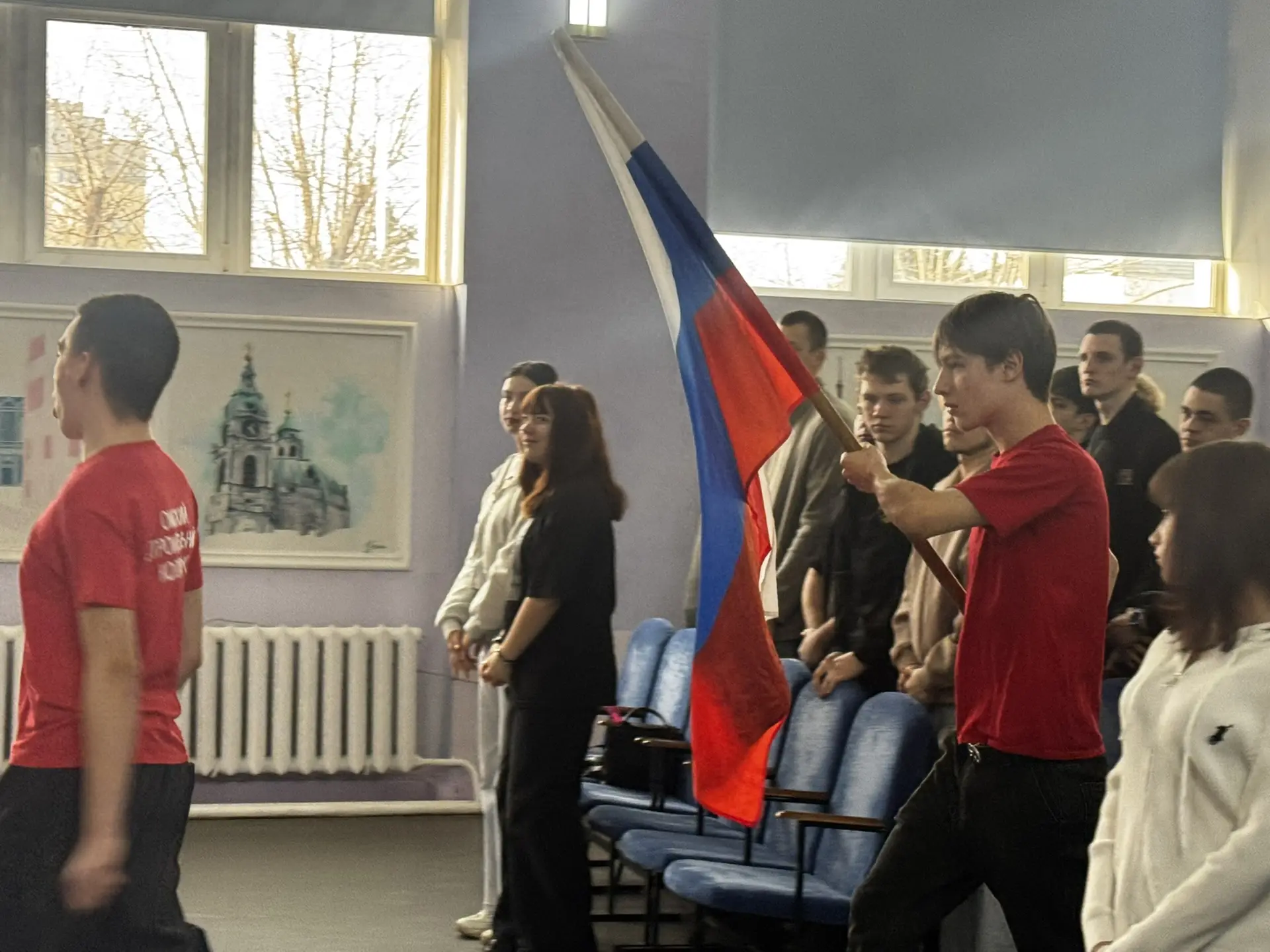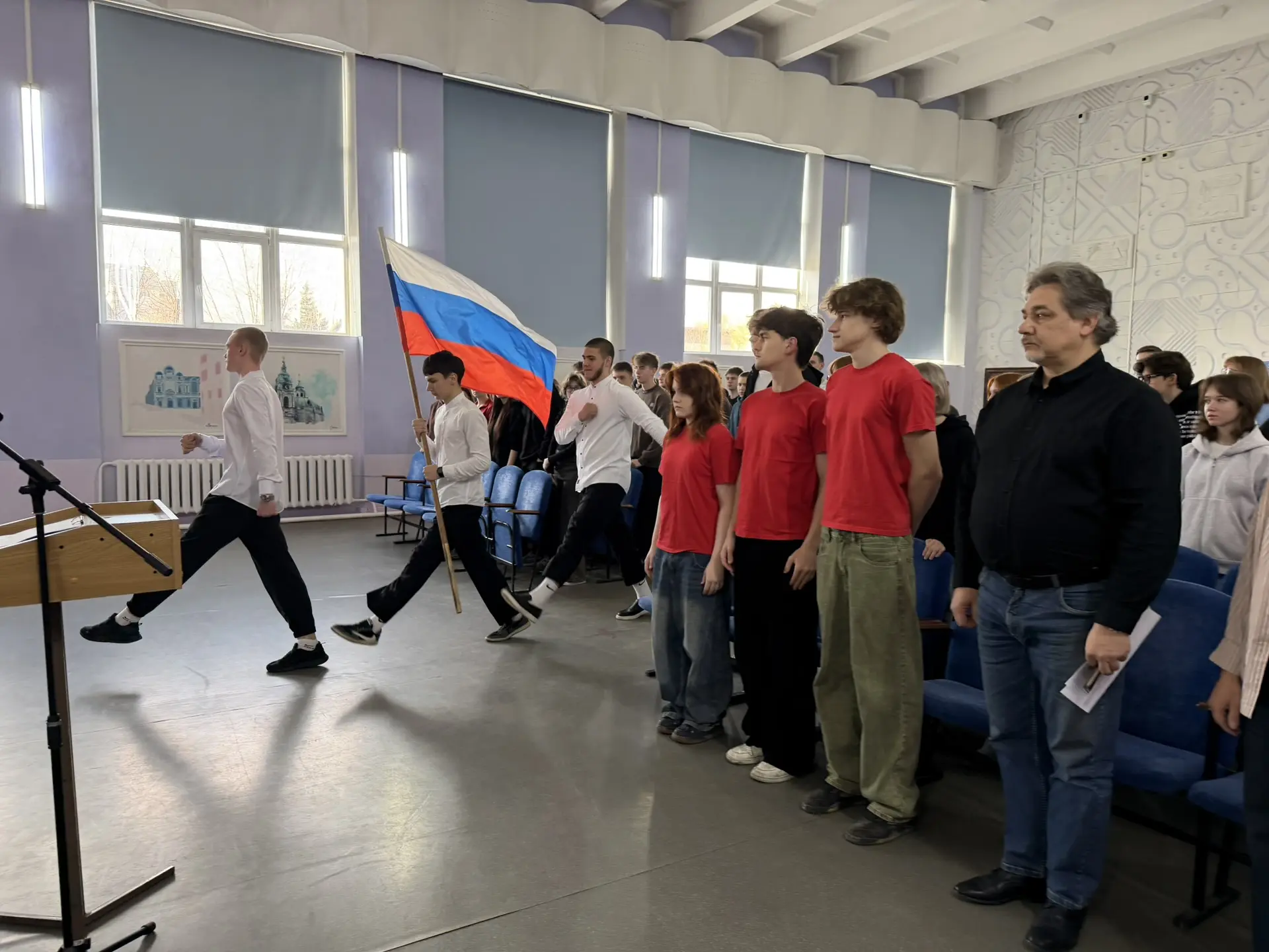 Честь вынести флаг была доверена студентам 112 группы: Феоктистову Александру, Катюшкину Матвею и Булычеву Игорю.