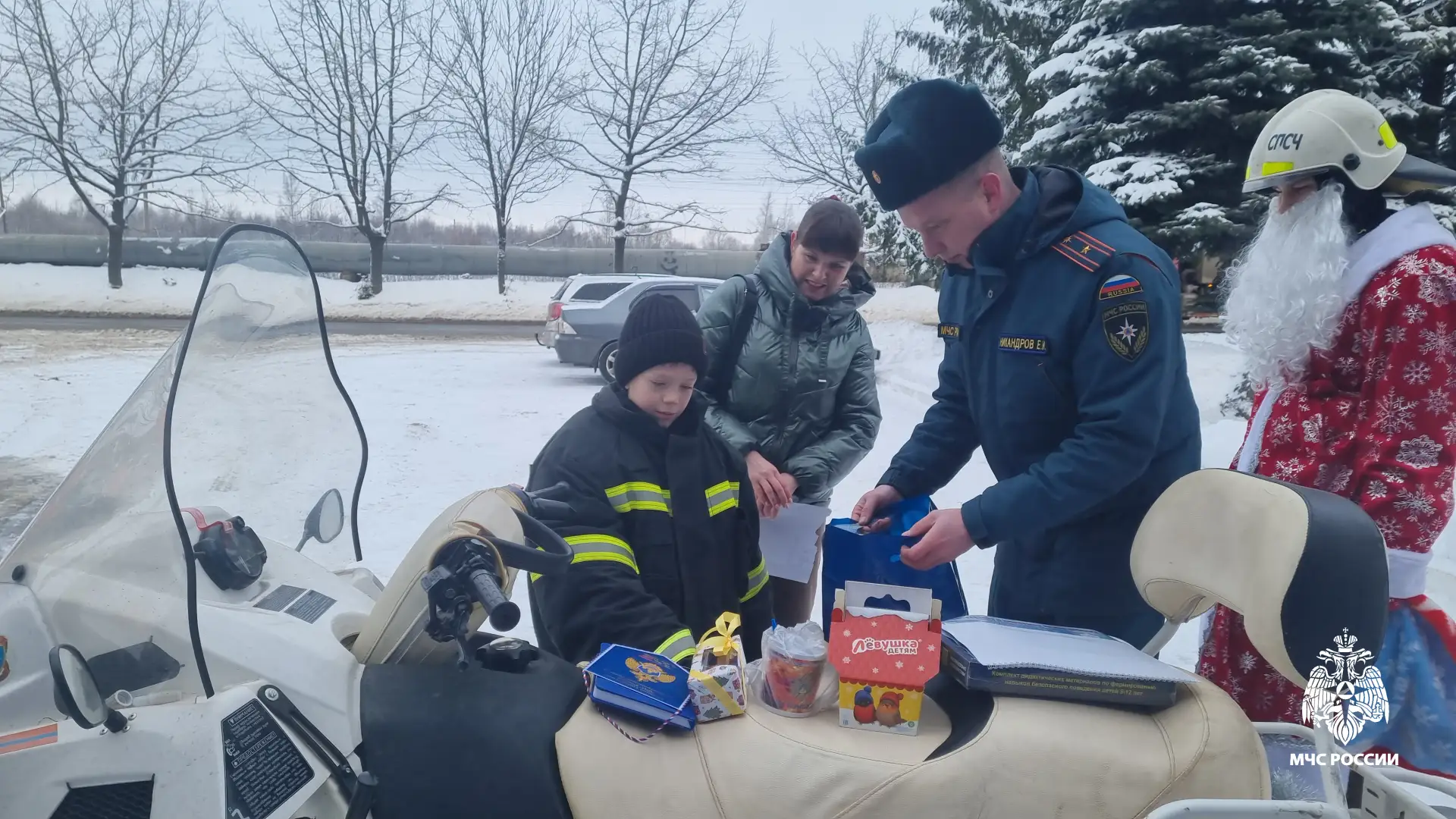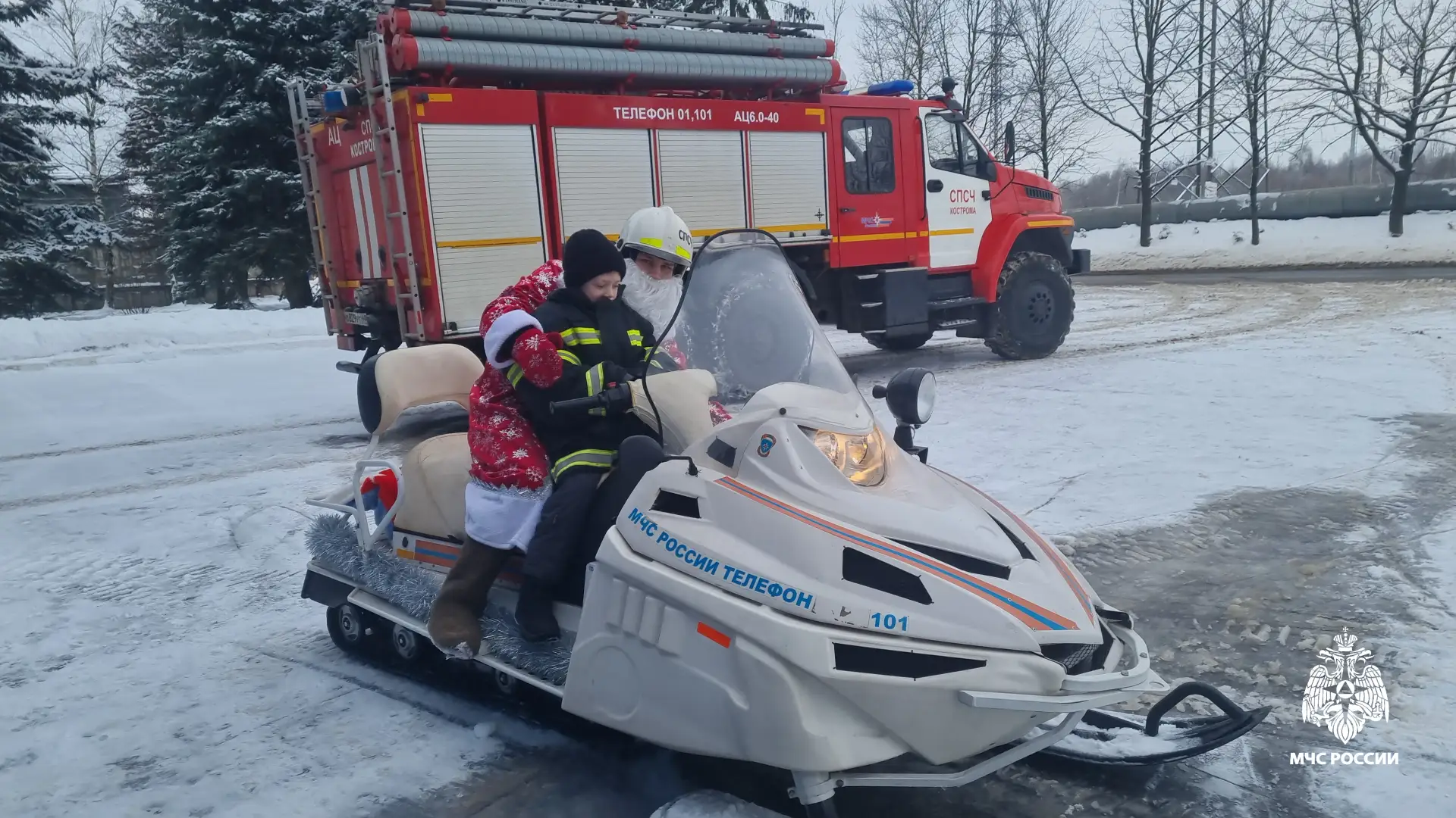 🔹Сюрпризы на этом не закончились! На фасаде пожарно-спасательной части Сашу поджидал настоящий Пожарный Дед Мороз. Волшебник поздравил мальчика с наступающим Новым годом, подарил подарки и напомнил о правилах безопасности. А в завершении экскурсии Пожарный Дед Мороз раскрыл небольшой секрет! Он показал, как будет ездить дарить подарки и поздравлять других детей перед Новым годом. Вместо оленей у него на вооружении снегоход! Добрый волшебник прокатил юного костромича на специализированной технике и пожелал в будущем прийти на службу в МЧС России!
