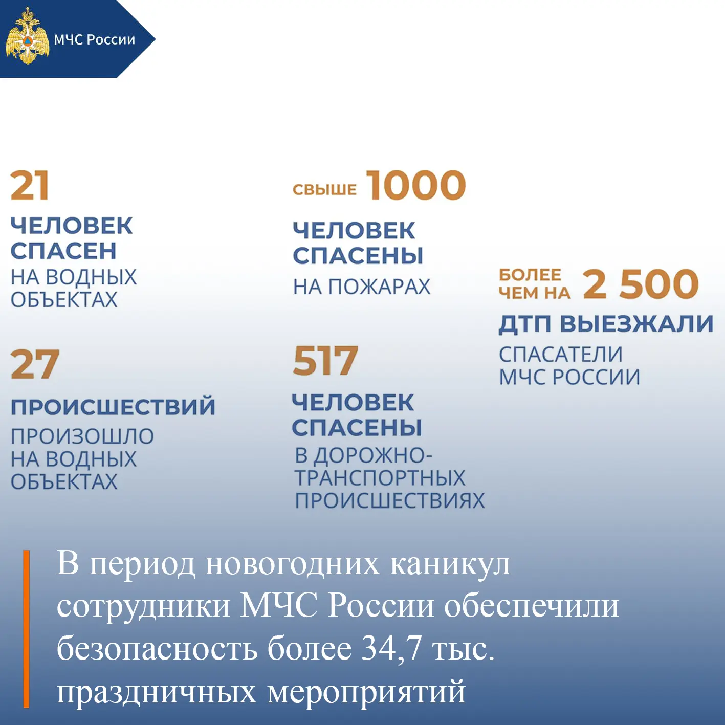 🔹 В период новогодних каникул сотрудники МЧС России обеспечили безопасность более 34,7 тыс. праздничных мероприятий