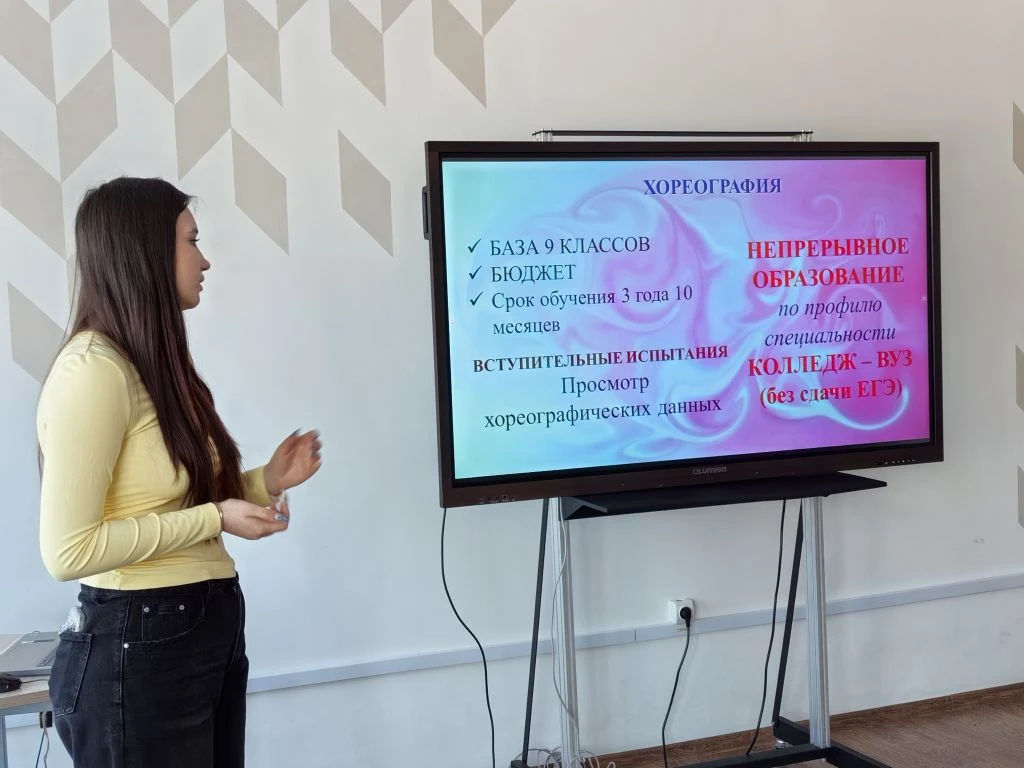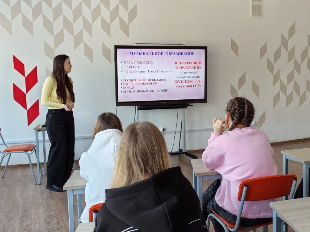 В рамках Всероссийской акции "Классные встречи" в МОБУ Гимназия г. Тюкалинска прошло профориентационное мероприятие, встреча с выпускницей Гимназии, студенткой Омского музыкально-педагогического колледжа Чеботаевой Марией. В своём выступлении Мария рассказала ребятам о порядке поступления на музыкальные отделения, курсах подготовки для поступления на актерское и режиссерские направления, о содержании творческих вступительных испытаний и возможностях эффективной самостоятельной подготовки. Мария ответила на многочисленные вопросы и пригласила ребят и родителей посетить 20 марта 2026 года День открытых дверей в колледже для более подробного знакомства со всеми девятью направлениями работы учебного заведения.
