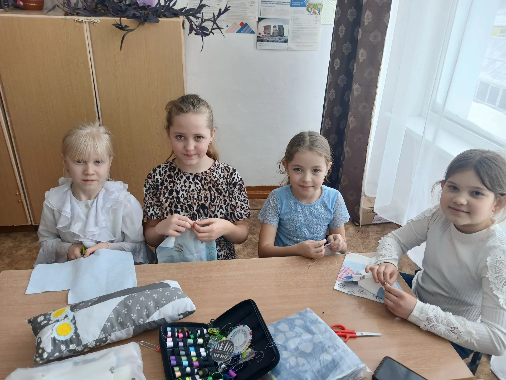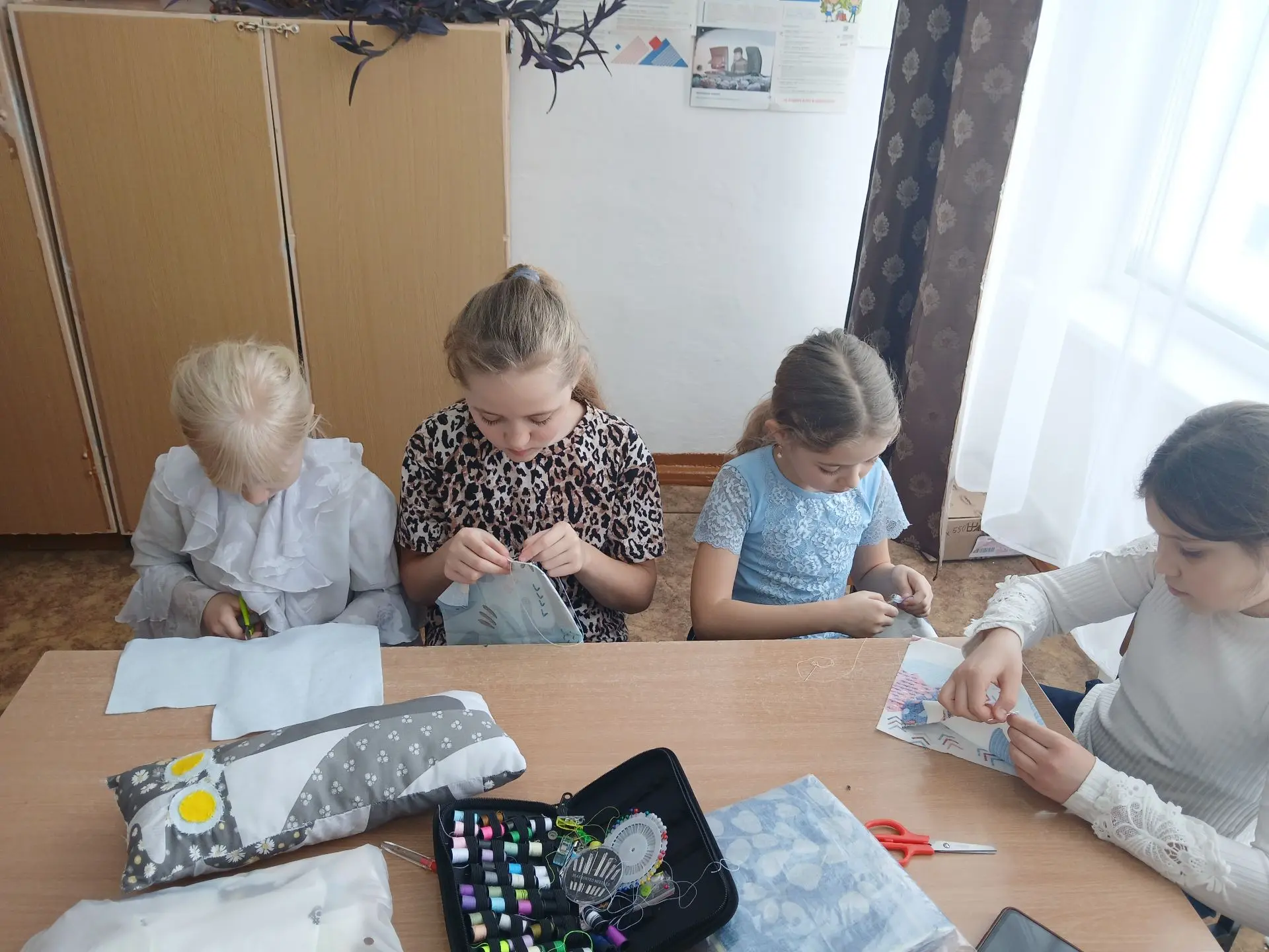 На последних занятиях участницы кружка с увлечением взялись за новый проект — пошив оригинальных подушек‑игрушек. Под чутким руководством педагога девочки учатся работать с выкройками, подбирать гармоничные сочетания тканей и выполнять аккуратные швы.