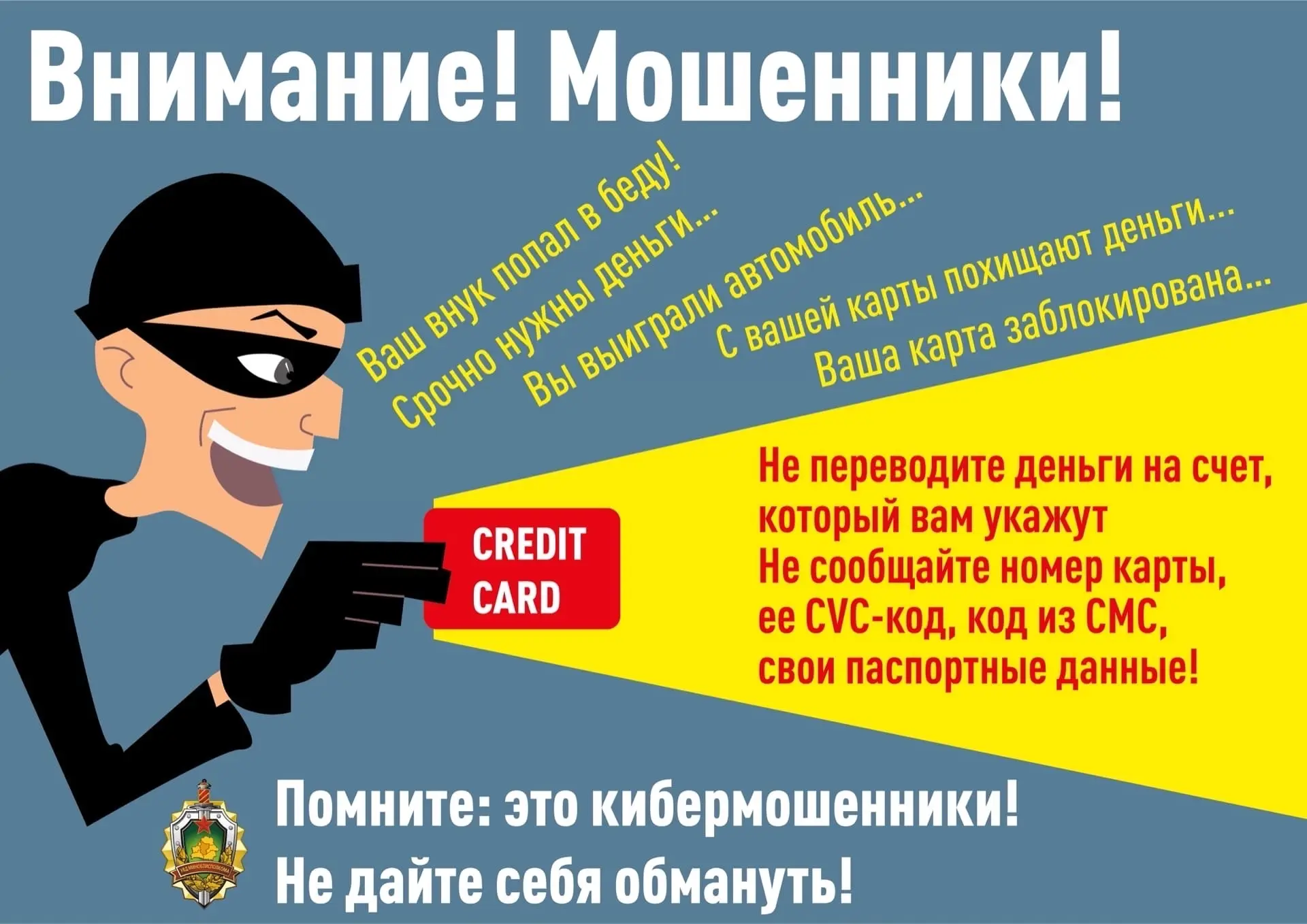 • не перезванивайте и не направляйте ответные SMS, если Вам поступило сообщение о блокировании банковской карты. Свяжитесь с банком, обслуживающим Вашу карту;
