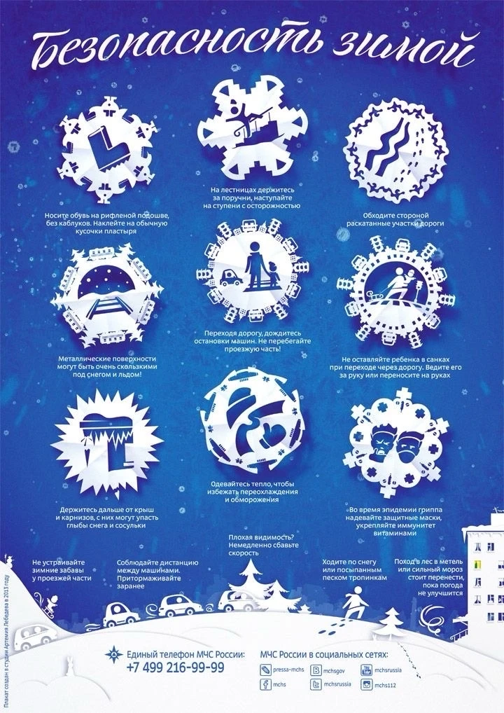 ❄ 3. Соблюдайте правила безопасного поведения во время прогулок. Запрещается пребывание на реке, водоеме в период зимних каникул. Остерегайтесь гололёда, во избежание падений и получения травм; будьте внимательны вблизи зданий, с крыш которых может свисать снег и лёд.