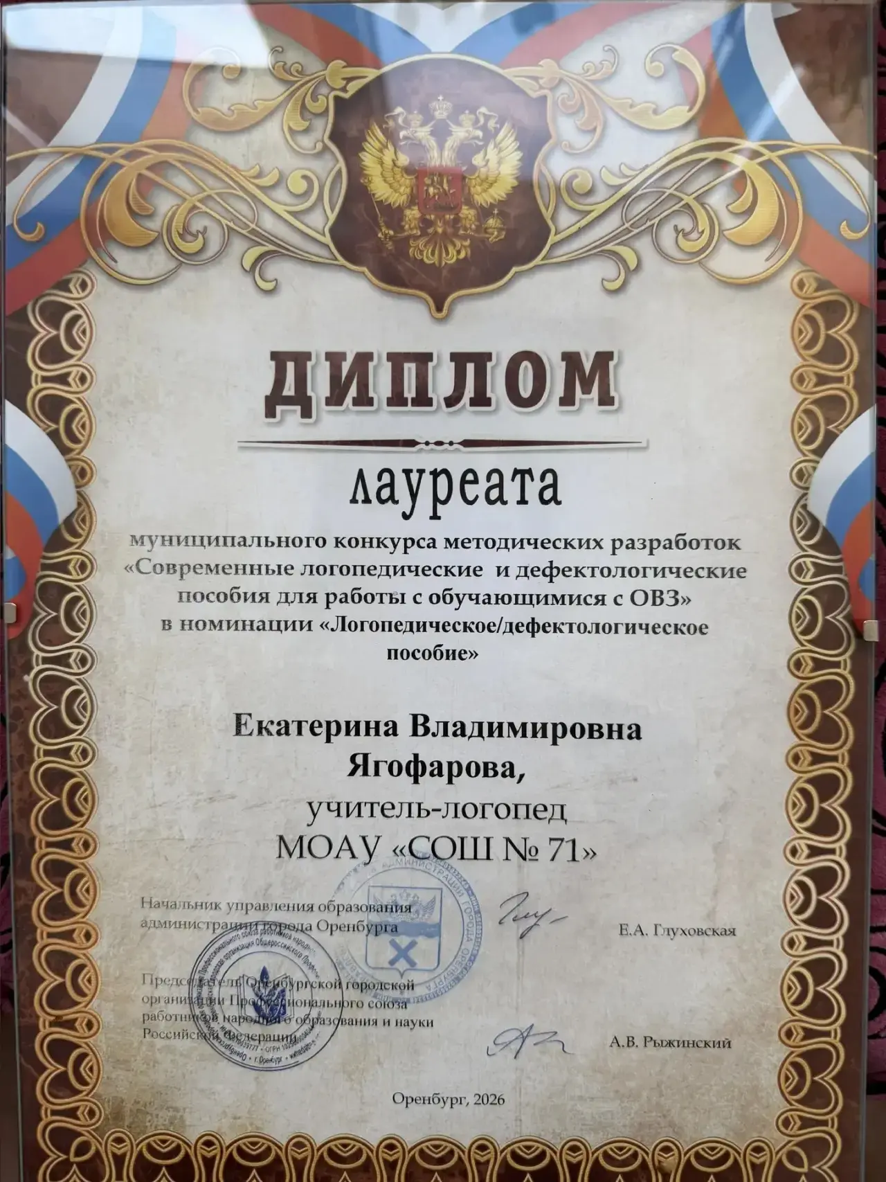 На городском методическом объединении учителей-логопедов и дефектологов подводились итоги конкурса логопедических пособий. Ягофарова Екатерина Владимировна, учитель логопед нашей школе стала лауреатом конкурса и получила заслуженную награду лауреата конкурса «Современные логопедические и дефектологические пособия для работы с обучающимися с ОВЗ» 2026. Екатерина Владимировна, сердечно поздравляем с заслуженной наградой.