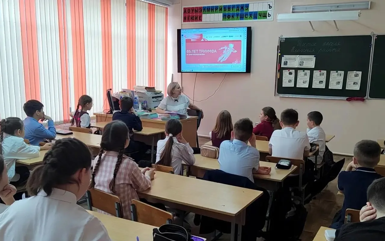 Сегодня занятие "Разговоры о важном" было посвящёно теме "65 лет триумфа. 80 лет космической отрасли. Ко Дню космонавтики".