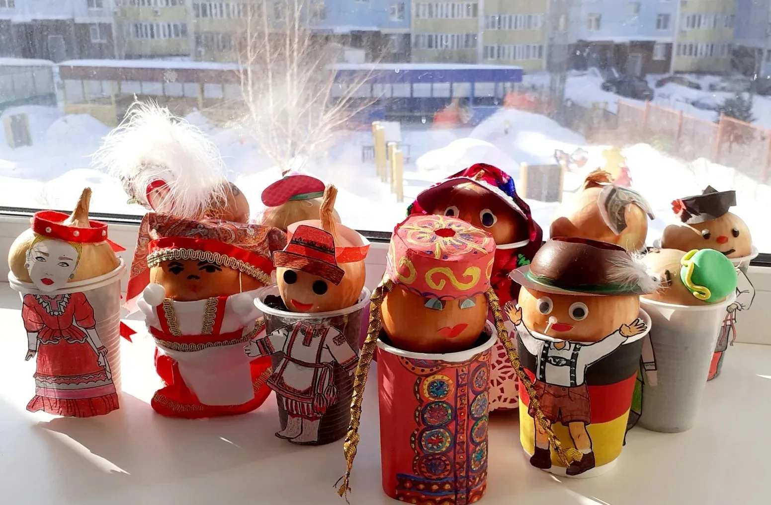 Ребята вместе с родителями и воспитателями превратили обычные луковицы в веселых человечков, одев их в яркие народные костюмы.