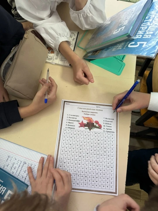 А чтобы окончательно закрепить знания и развеять скуку, активисты предложили ребятам… ФИЛВОРД! Да-да, тот самый, где из хаоса букв нужно выуживать знакомые слова! Только ключевые имена и события Сталинградской битвы!