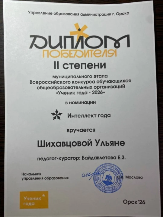 Этот диплом – не просто бумажка, это символ того, что наш мозг – это самая мощная машина во Вселенной, когда в нем горит огонек любознательности и жажда открытий! Так что, ребята, держите курс на знания, и кто знает, может, следующий "Ученик года" – это вы! А Ульяне – наша бурная овация и пожелание новых, еще более головокружительных побед!