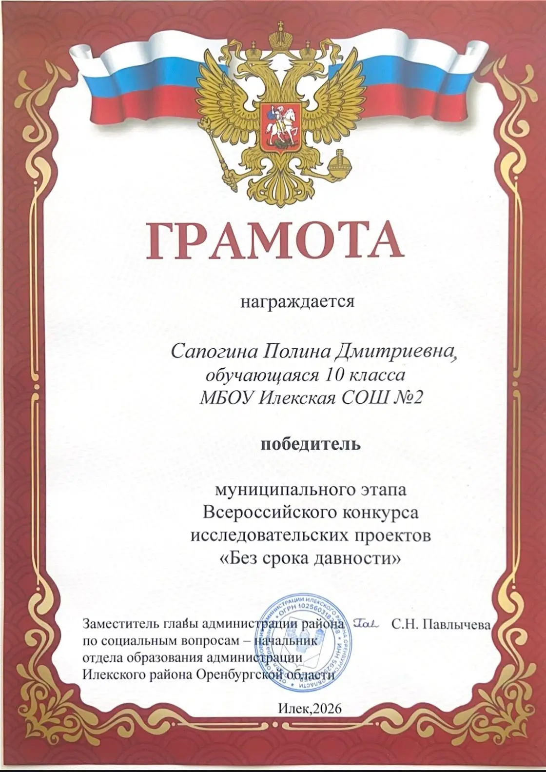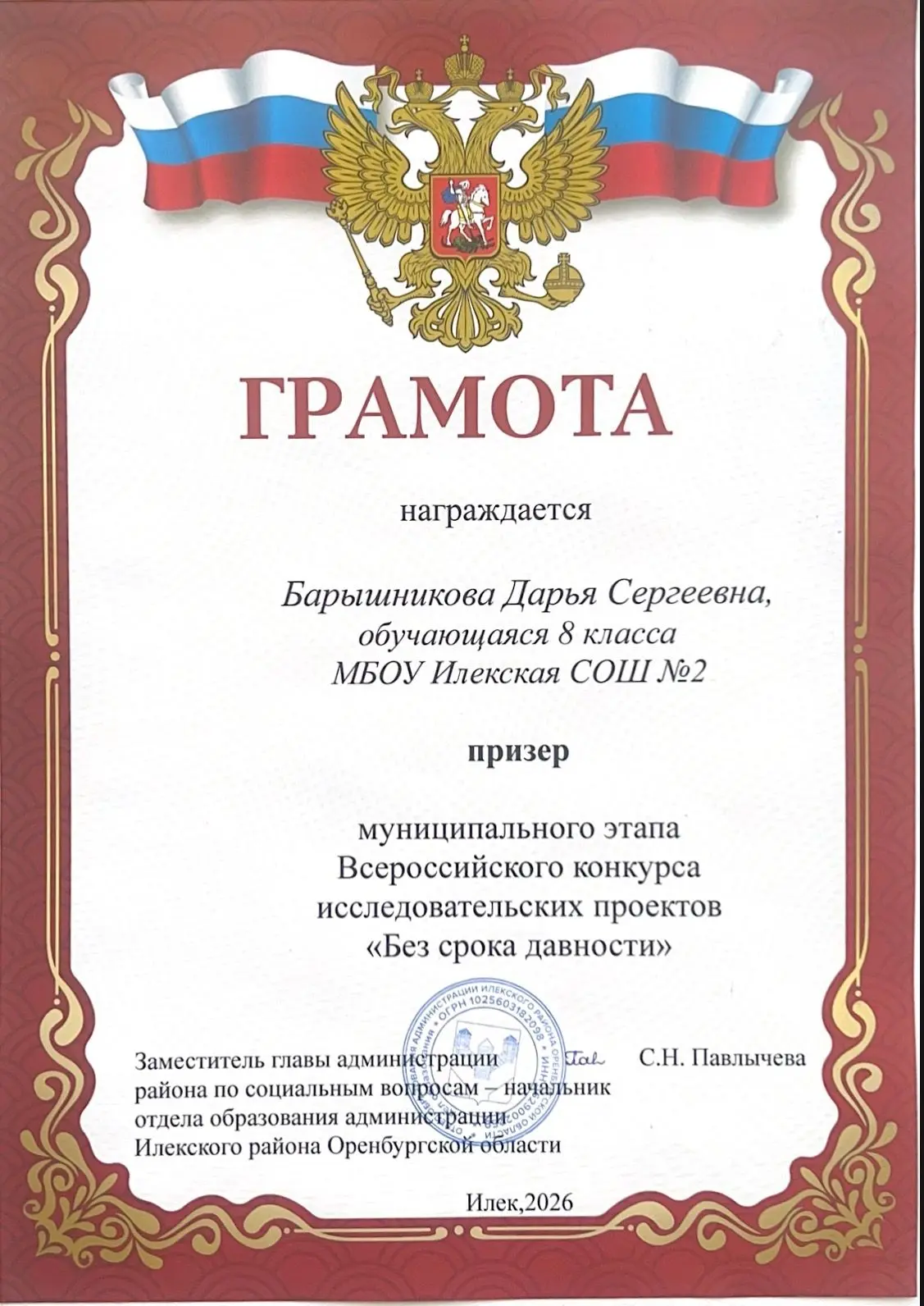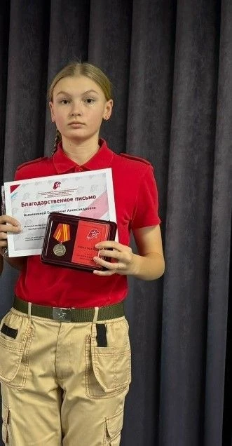Согласно приказу Начальника Главного Штаба ВВПОД «Юнармия» № 165 от 1 декабря 2025 года, награду получила Екатерина Асминкина из юнармейского отряда «Звезда» нашей школы.