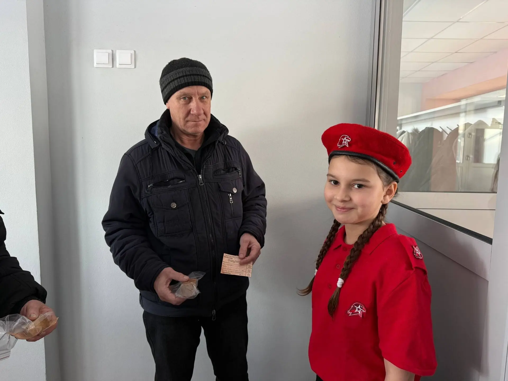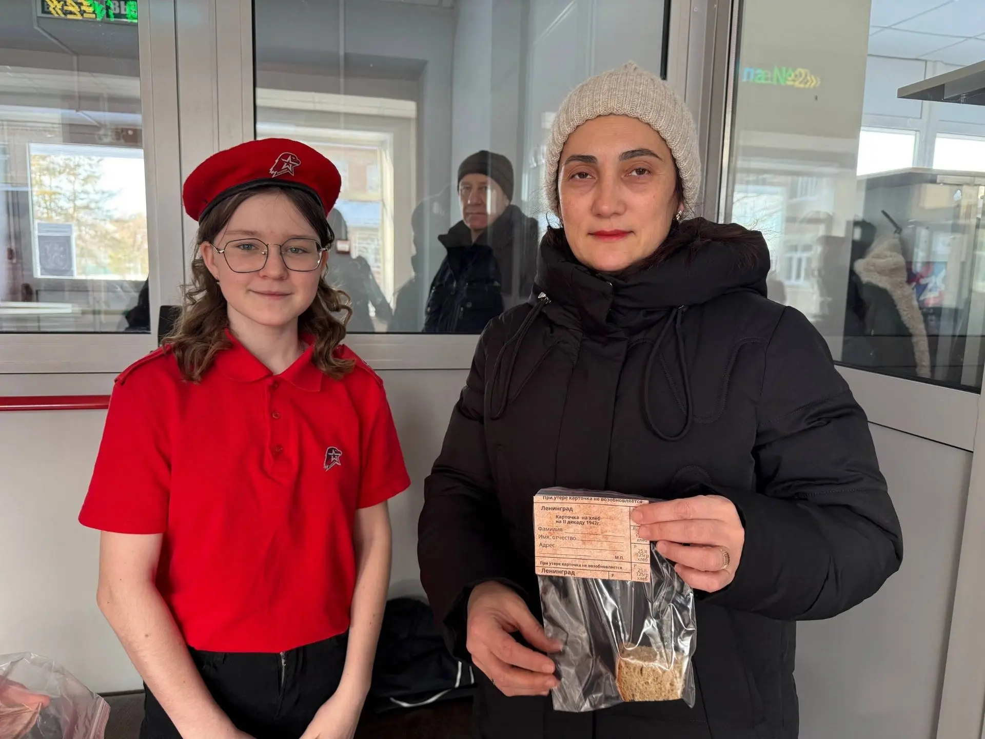демонстрировали реплики продуктовых карточек и объясняли, из чего состоял блокадный хлеб (в его состав входили жмых, целлюлоза, солод и лишь небольшая доля муки);