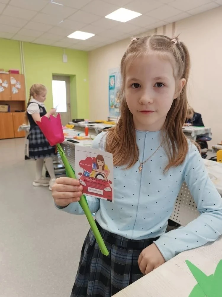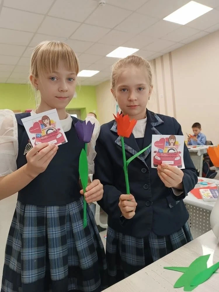 В рамках Акции ребята 2 Б и 3б классов изготавливали, а потом подарили мамам-водителям поделки - тюльпаны с пожеланиями безопасного поведения на дорогах «Мама, будь внимательна», «Мама, пристегнись», «Мама, не торопись».