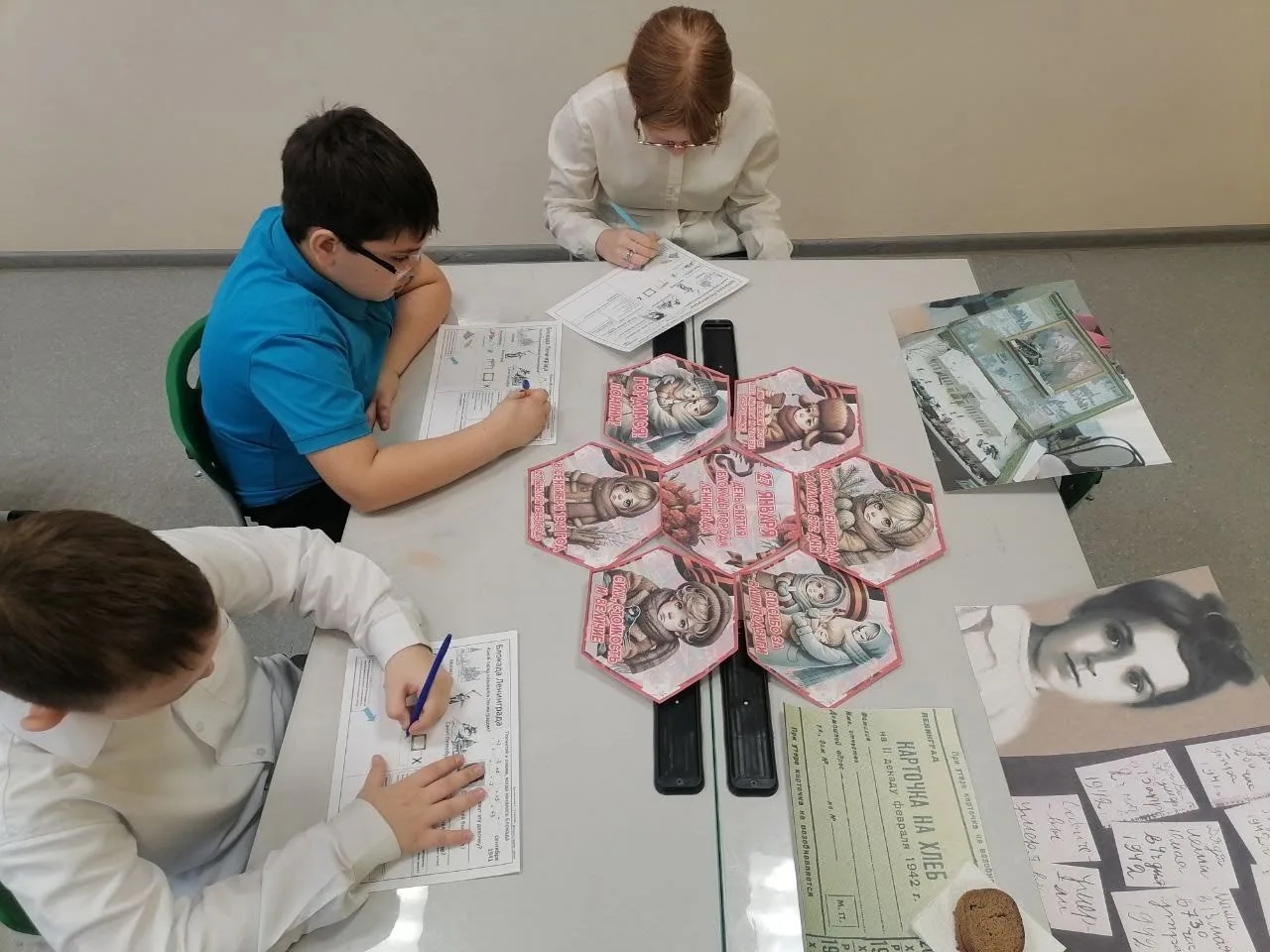 В рамках урока участники увидели реплику блокадной хлебной карточки и узнали состав того самого хлеба, в который входили не только мука, но и жмых, целлюлоза и солод.