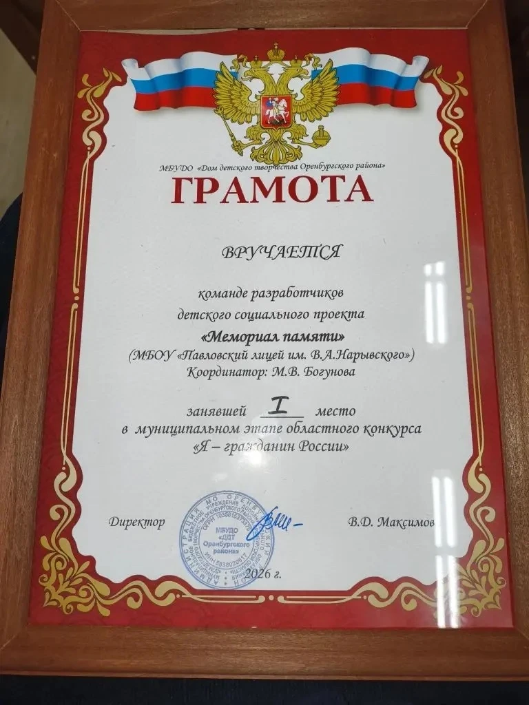 Ученики 8 «Б» класса Павловского лицея Абдулгазизов Руслан, Бисултанова Алина, Кузнецова Виктория, Латыпова Сафина, Николаенко Николай и Нуриева Рузалина — взяли первое место в номинации «Сохранение и развитие культурного и исторического наследия» на XXVI областном конкурсе «Я–гражданин России»!