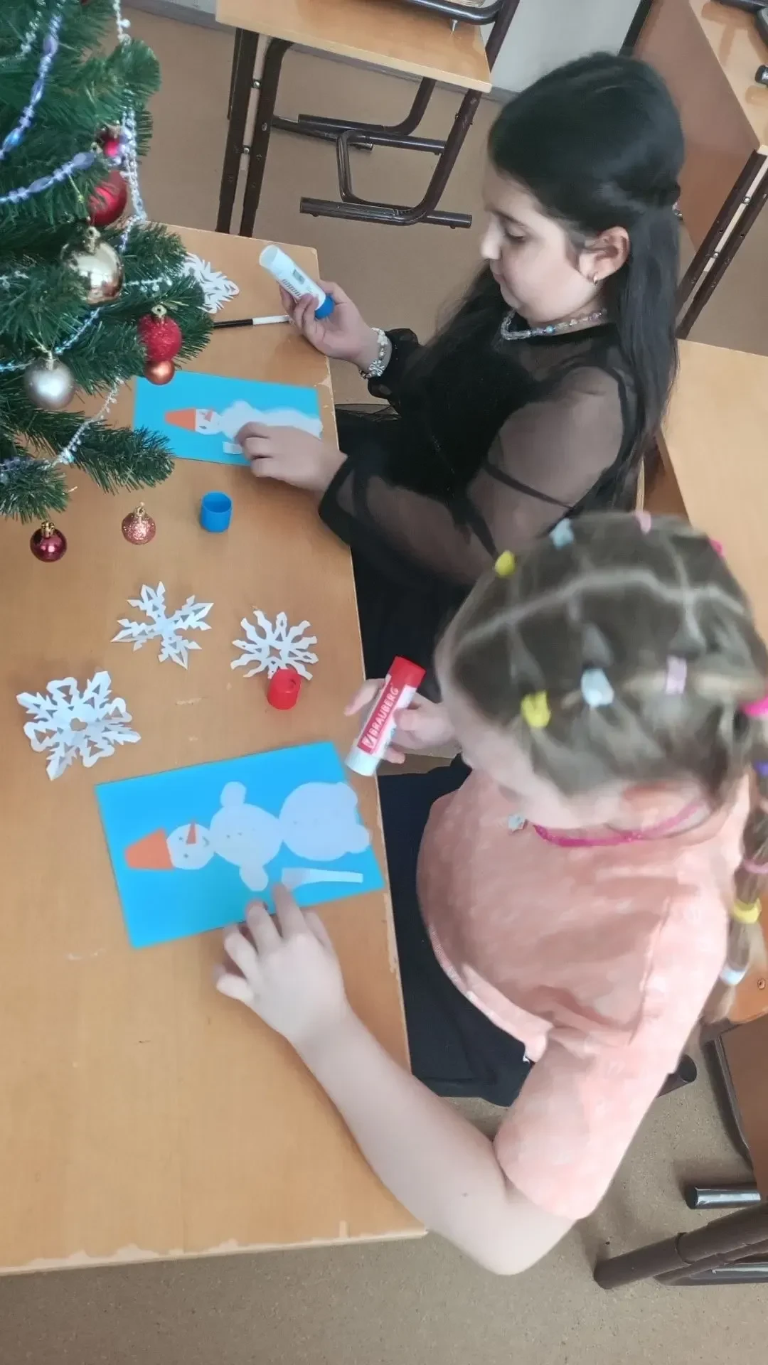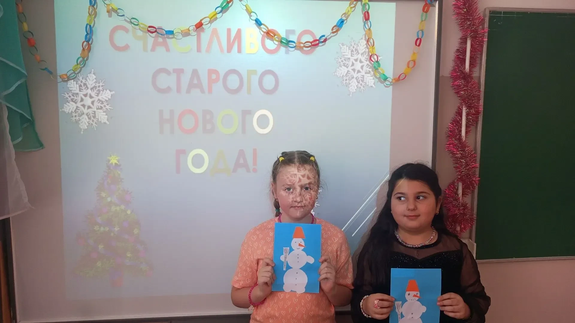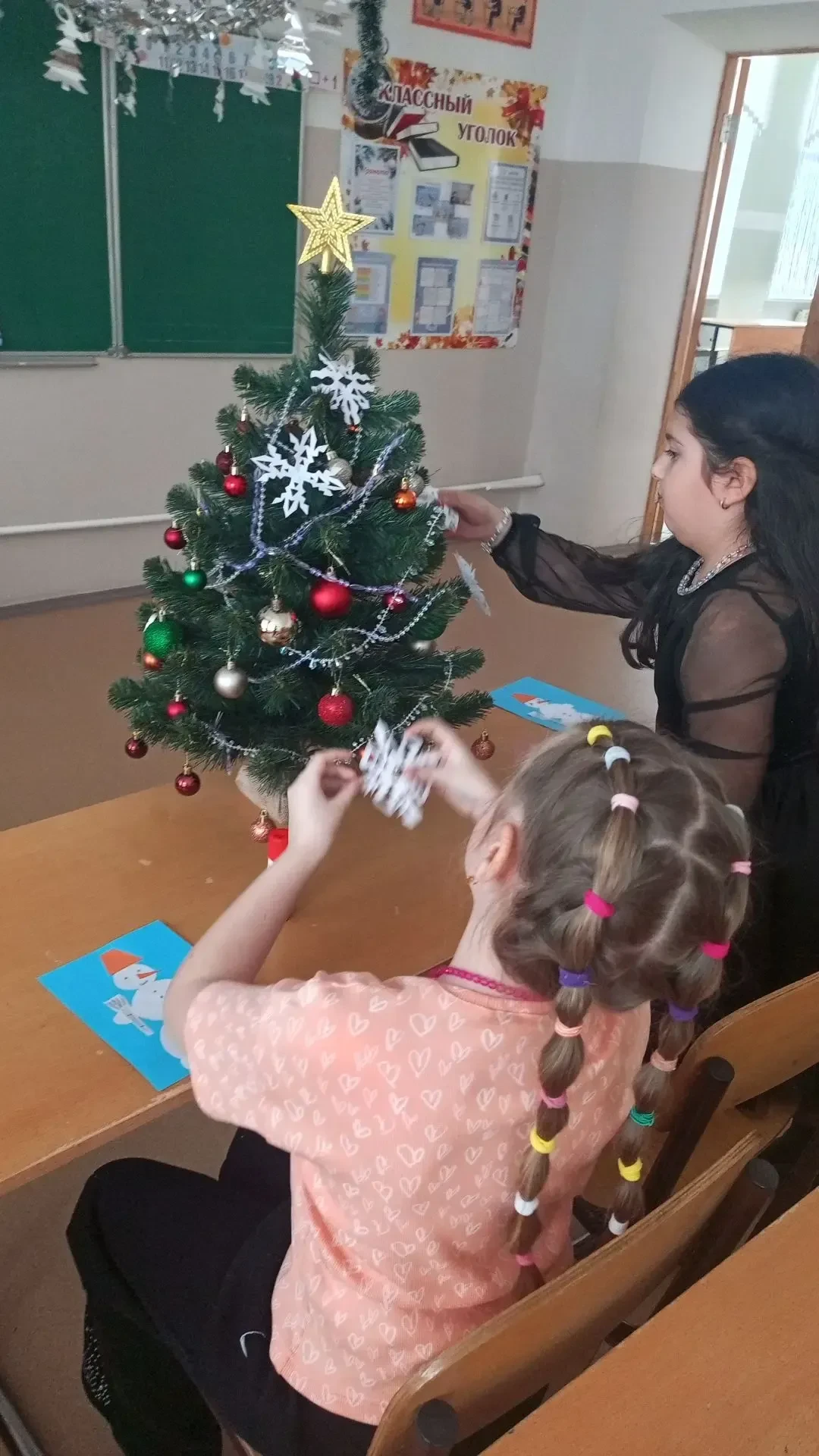 Ребята снимали снежинки с Новогодней ёлки и выполняли задания: