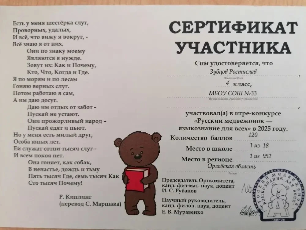 Обучающийся 4 Б класса Зубцов Ростислав 🏆 стал победителем (1 место в регионе) Международной игры-конкурса «Русский медвежонок — языкознание для всех» 🧠, продемонстрировав высокий уровень знаний в области русского языка 📚.