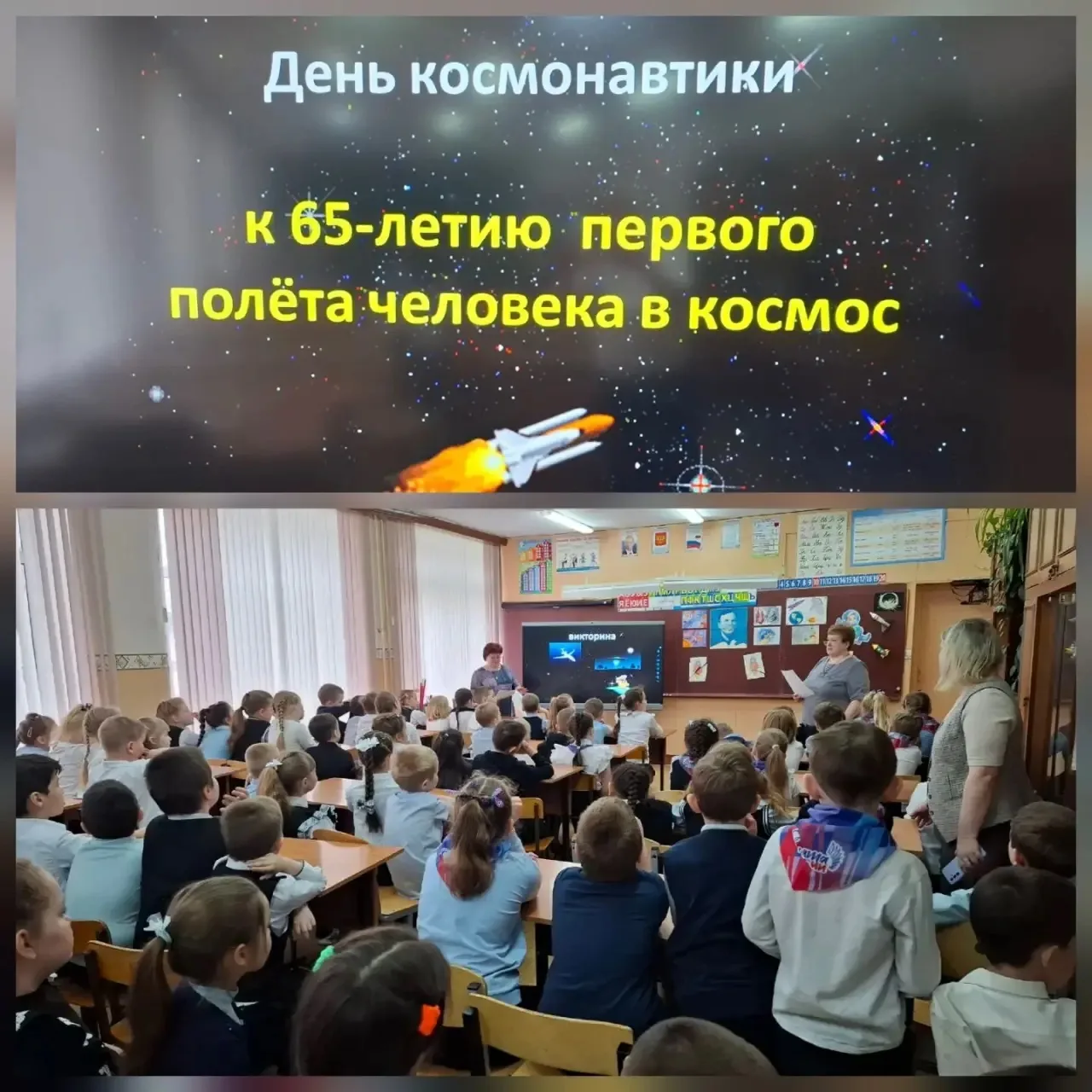 🚀Ученики первых классов вместе с классными руководителями приняли участие в познавательной викторине «День космонавтики». Ребята с азартом отвечали на вопросы, узнавали интересные факты о звёздах, планетах и первых шагах человечества в космическое пространство.