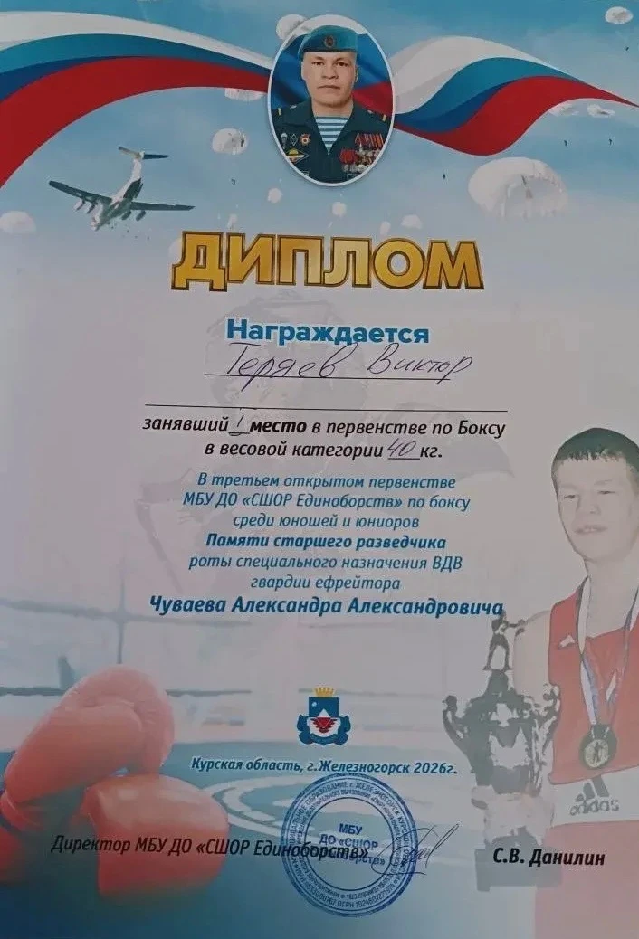 Обучающийся нашей школы 4 «Б» класса Теряев Виктор, занял I место в третьем открытом первенстве по боксу среди юношей и юниоров Памяти старшего разведчика роты специального назначения ВДВ гвардии ефрейтора Чуваева Александра Александровича г. Железногорска. 👏