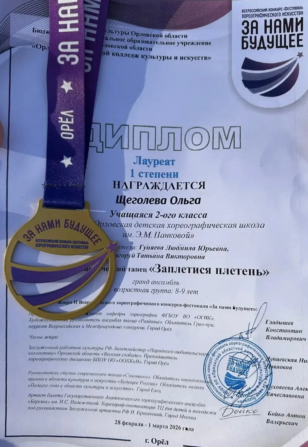 Поздравляем с победой в нелёгкой борьбе конкурсантку фестиваля хореографического искусства Щеголеву Ольгу, обучающуюся 2Б класса, которая стала лауреатом I степени.