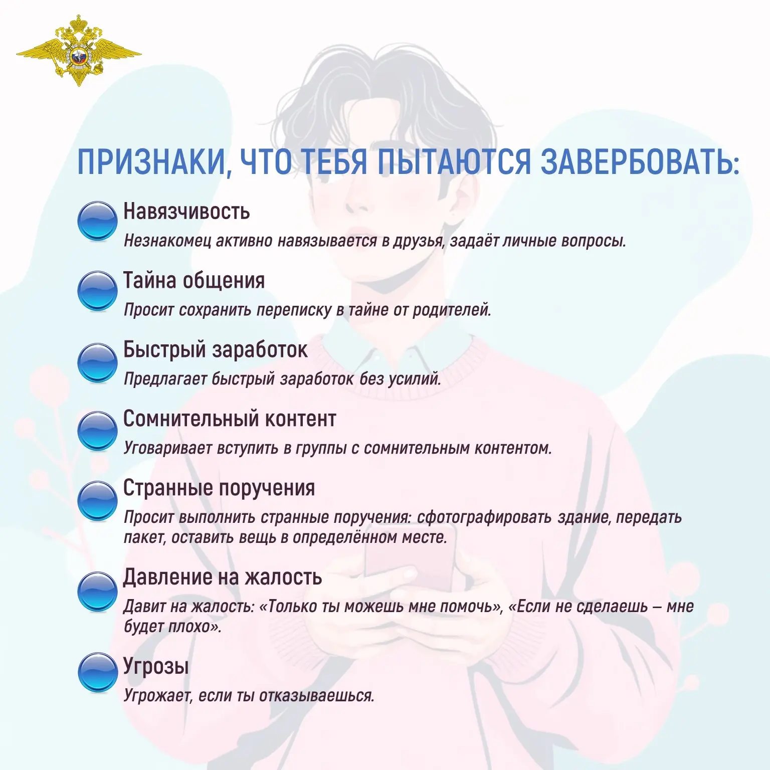 ‼Вербовщики часто вовлекают в противоправные деяния несовершеннолетних. Будьте бдительны, обязательно обсудите с детьми основные меры безопасности и профилактики.