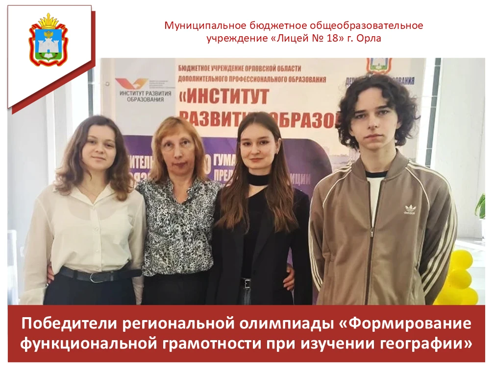 🏆Команда наших лицеистов одержала победу в региональной олимпиаде «Формирование функциональной грамотности при изучении географии» . Соревновались 52 участника (13 команд) из города Орла и Орловского муниципального округа.