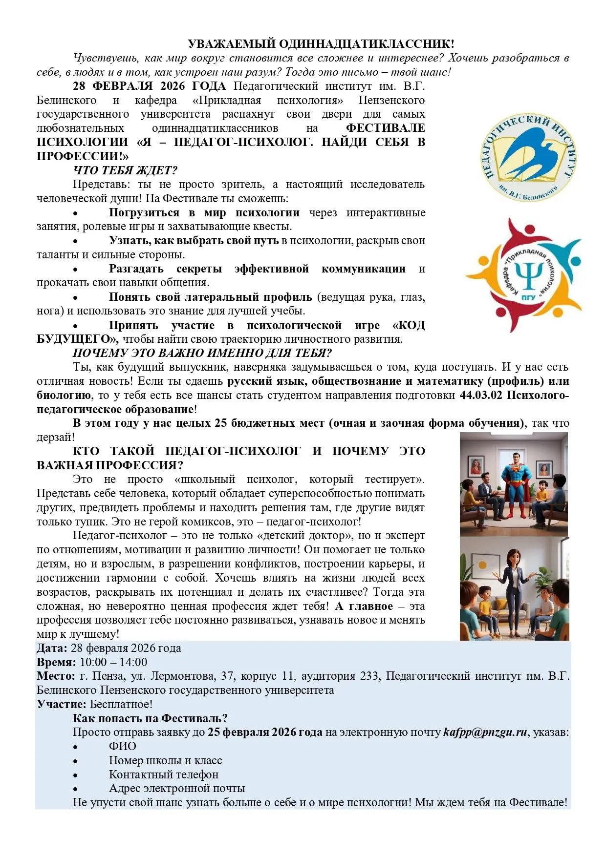 28 ФЕВРАЛЯ 2026 ГОДА в Педагогическом институте им. В.Г. Белинского состоится ФЕСТИВАЛЬ ПСИХОЛОГИИ «Я – ПЕДАГОГ-ПСИХОЛОГ. НАЙДИ СЕБЯ В ПРОФЕССИИ!»