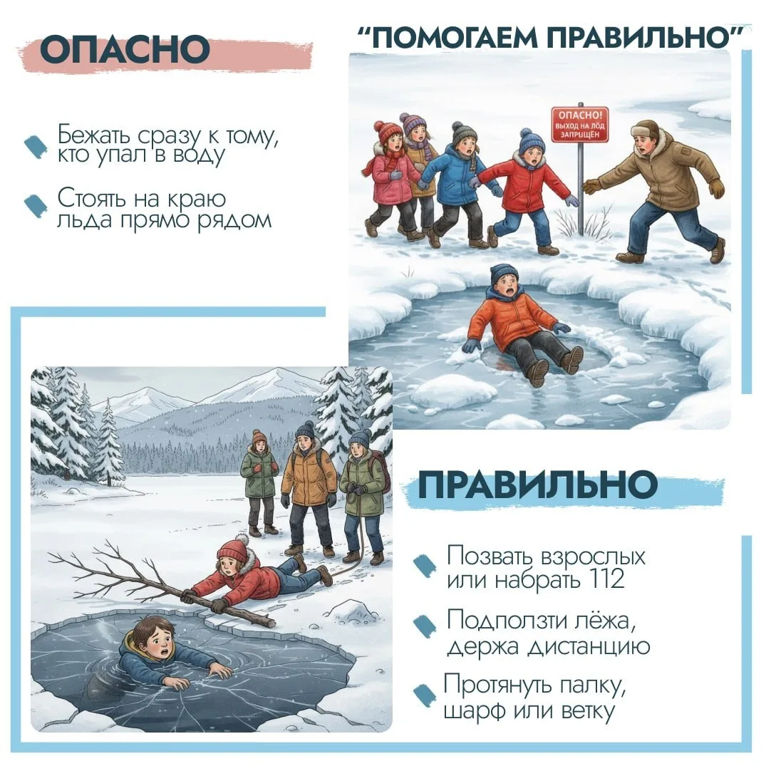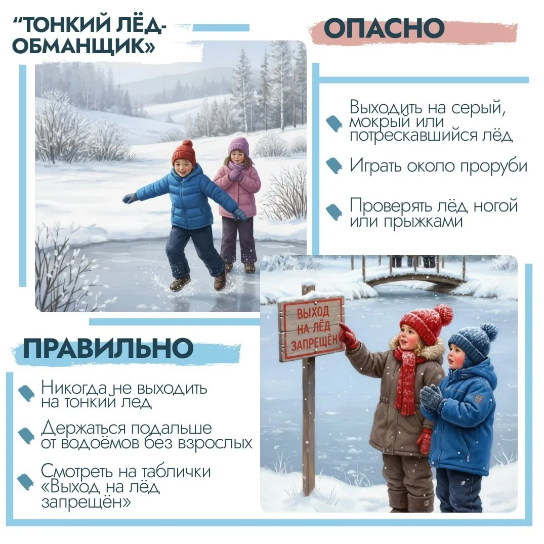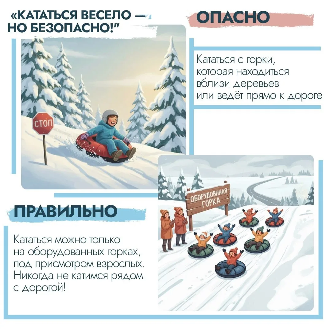 ❄️ Зима — время весёлых игр! Чтобы катания на горках и прогулки возле льда были безопасными, важно помнить простые правила.
