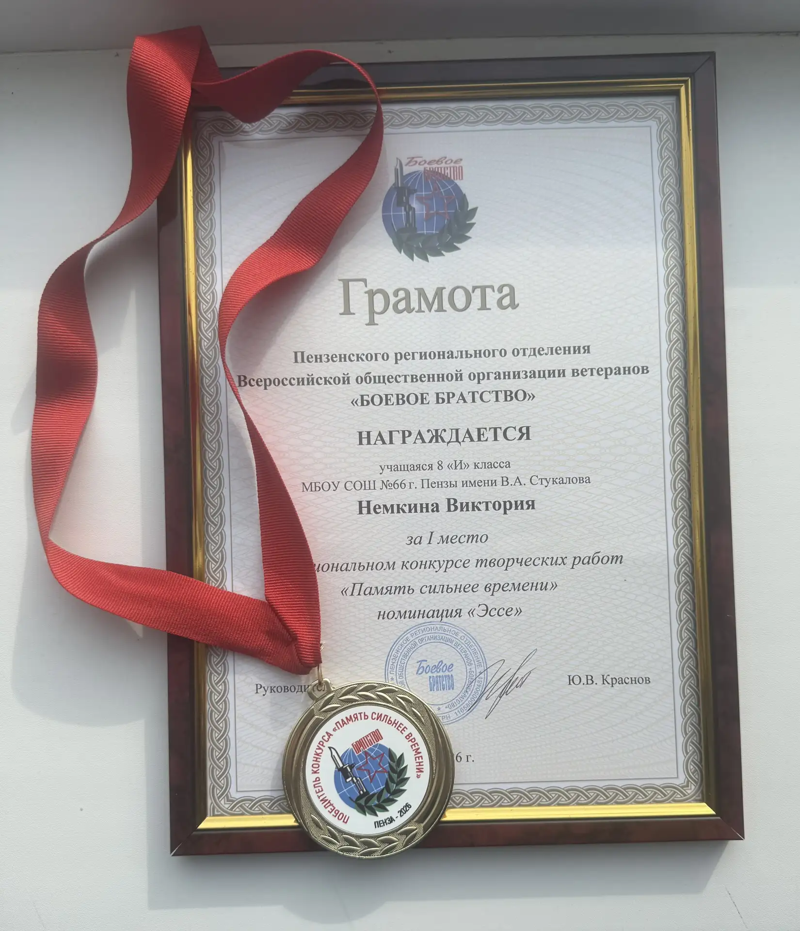 Виктория награждена грамотой и медалью от Пензенского регионального отделения Всероссийской общественной организации ветеранов «Боевое братство». Это высокая оценка её работы, её понимания истории и уважения к защитникам Отечества.