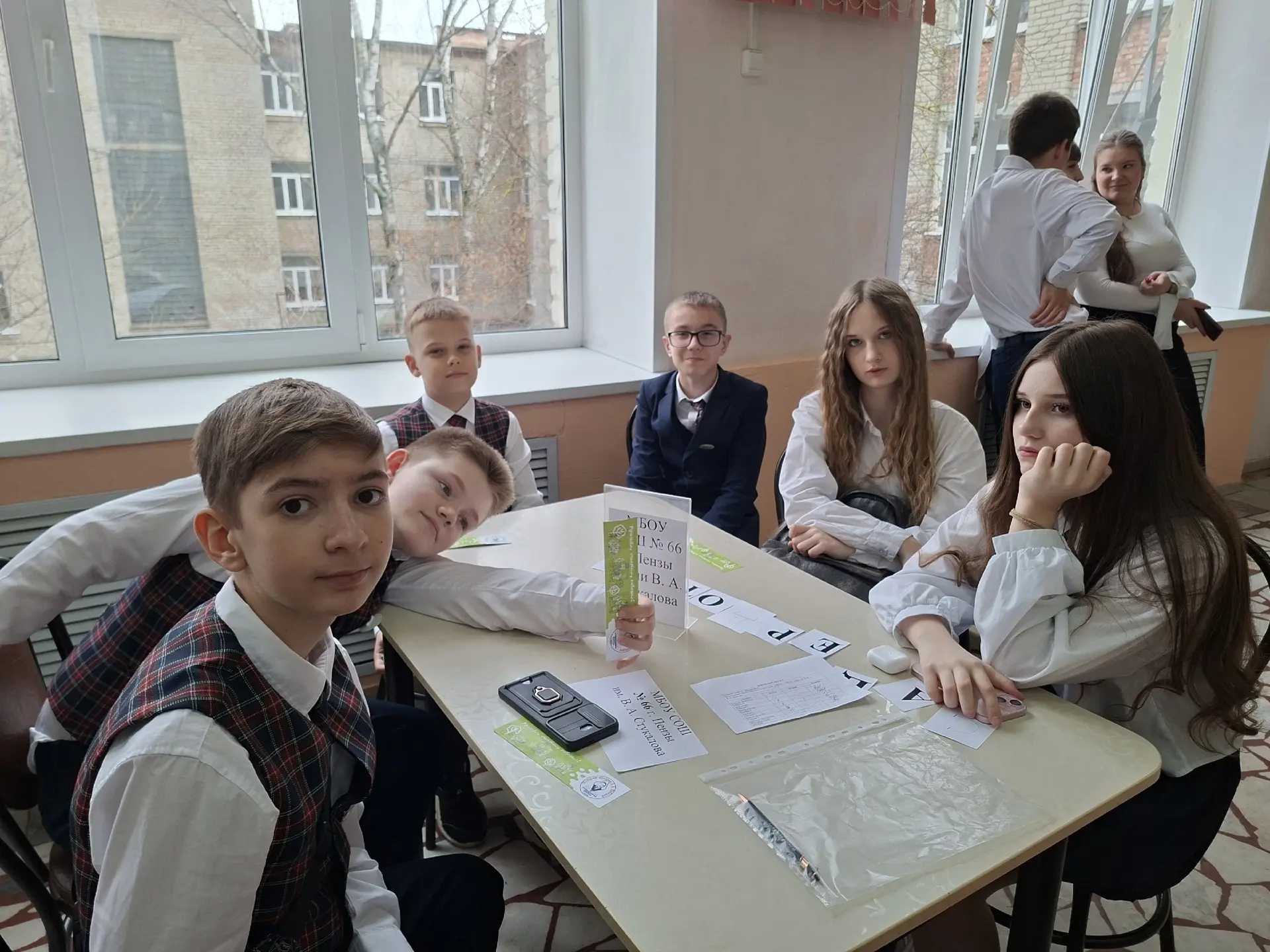 💫 В игре встретились сильнейшие команды из 19 школ города. Нашу школу представляли учащиеся 9 класса: Сорокина Полина, Данилова Анна, Пендюрин Максим, Алабушкин Денис и учитель истории О. И. Митрохина.