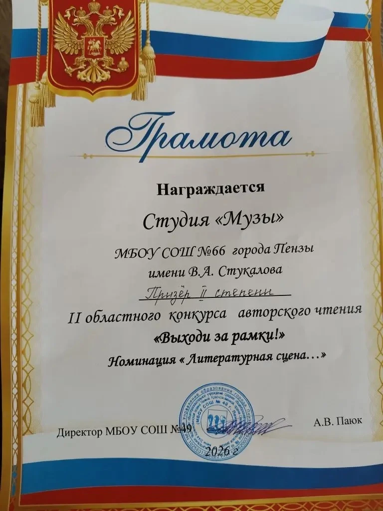 📚 Студия «Музы» приняла участие в номинации «Литературная сцена». Девочки представили авторское произведение, посвящённое единству народов России. Их выступление было ярким, искренним и по-настоящему трогательным. Жюри высоко оценило композицию, и наши участницы заняли 2 место!