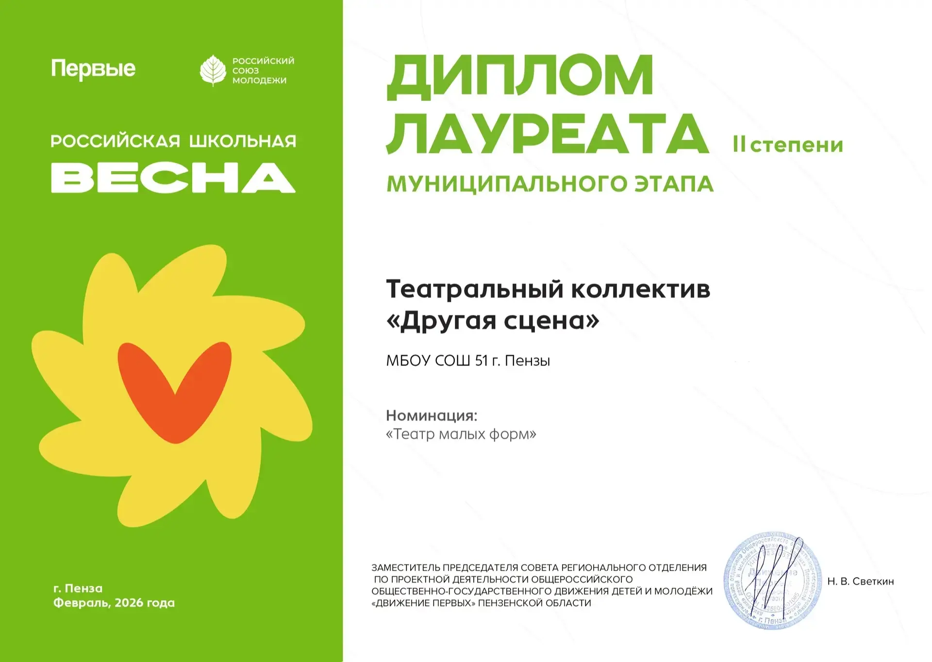 Поздравляем театральный коллектив 8 б класса "Другая сцена" с дипломом лауреата 2 степени муниципального этапа российского конкурса "Школьная весна".