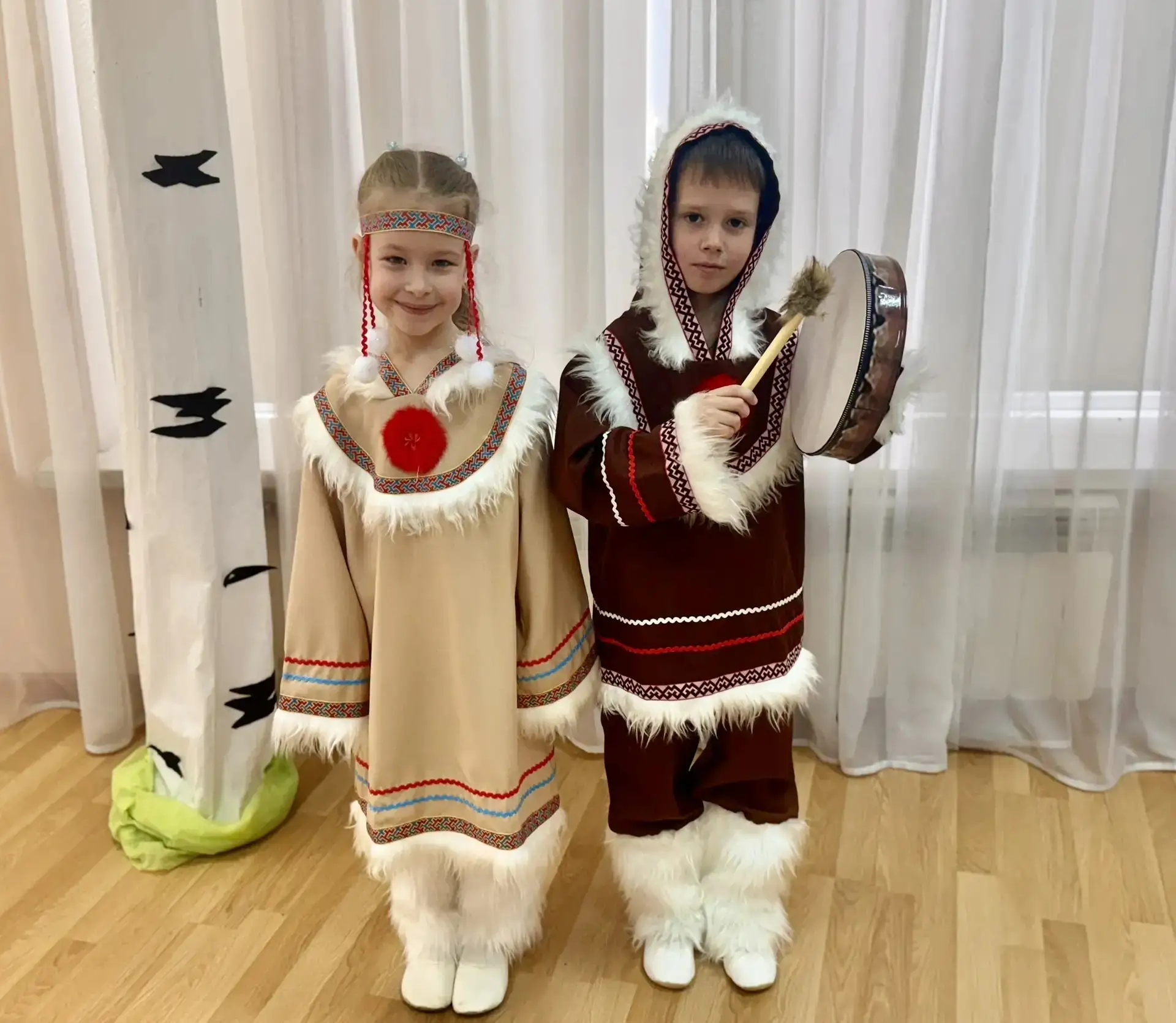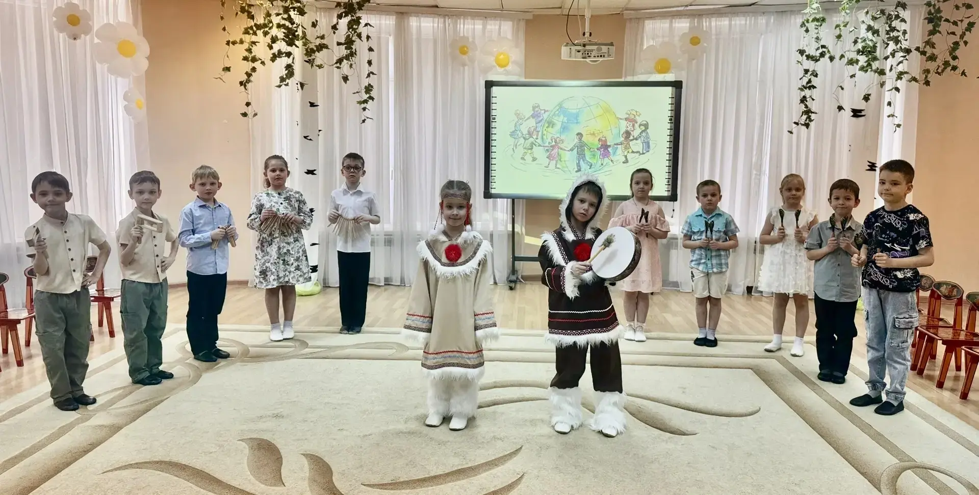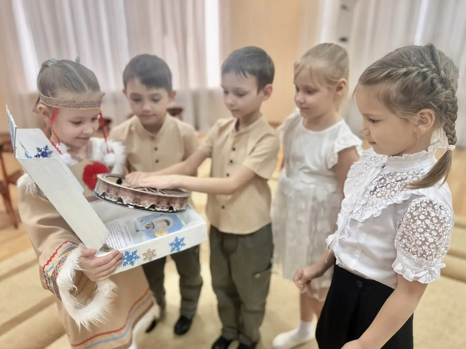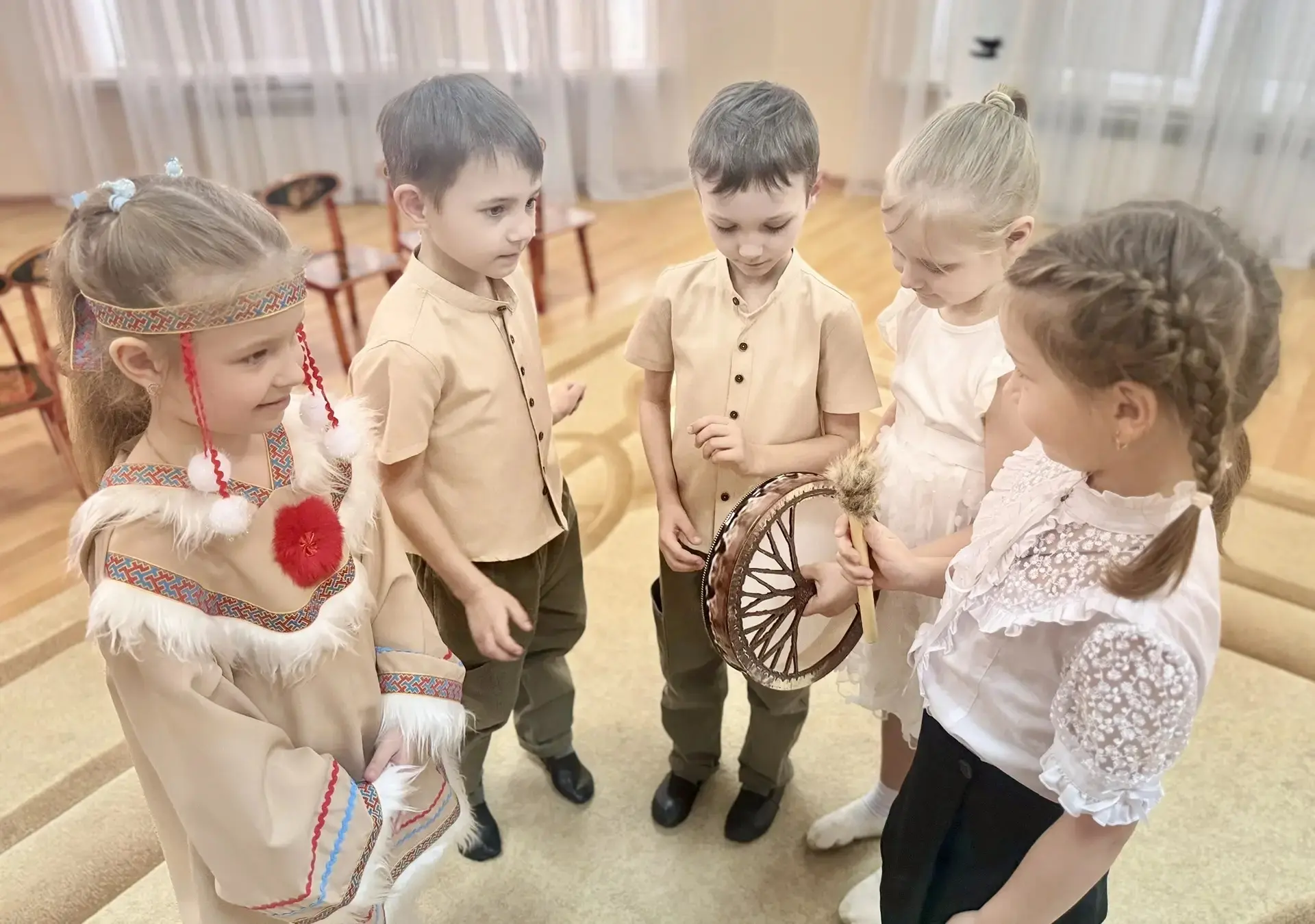 В гостях у жителей Севера ребята познакомились с бубном. С помощью бубна, трещоток и деревянных ложек дети создали свой собственный ритмический узор, передающий бег оленей и шум северного ветра.