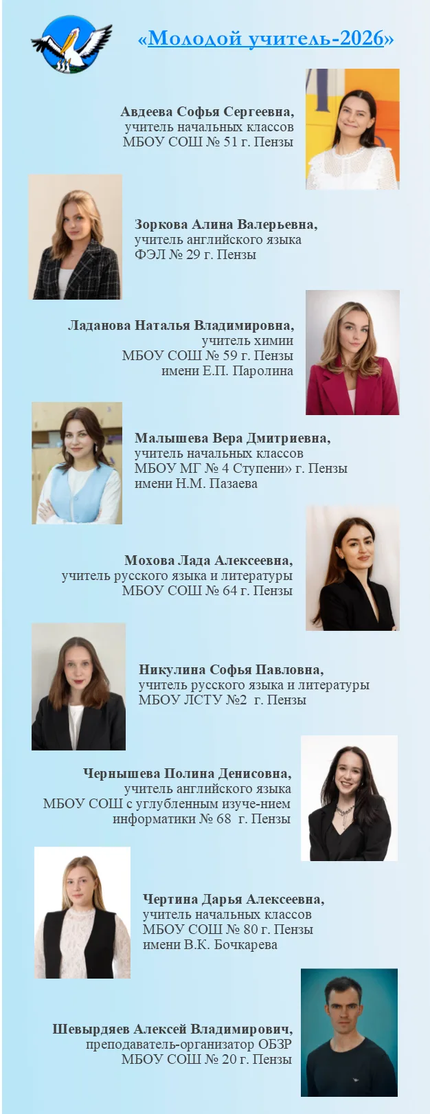 В 2026 году заявку на участие в конкурсе подали 9 молодых специалистов (3 учителя начальных классов, 2 учителя русского языка и литературы, 2 учителя английского языка, учитель химии и преподаватель-организатор ОБЗР):