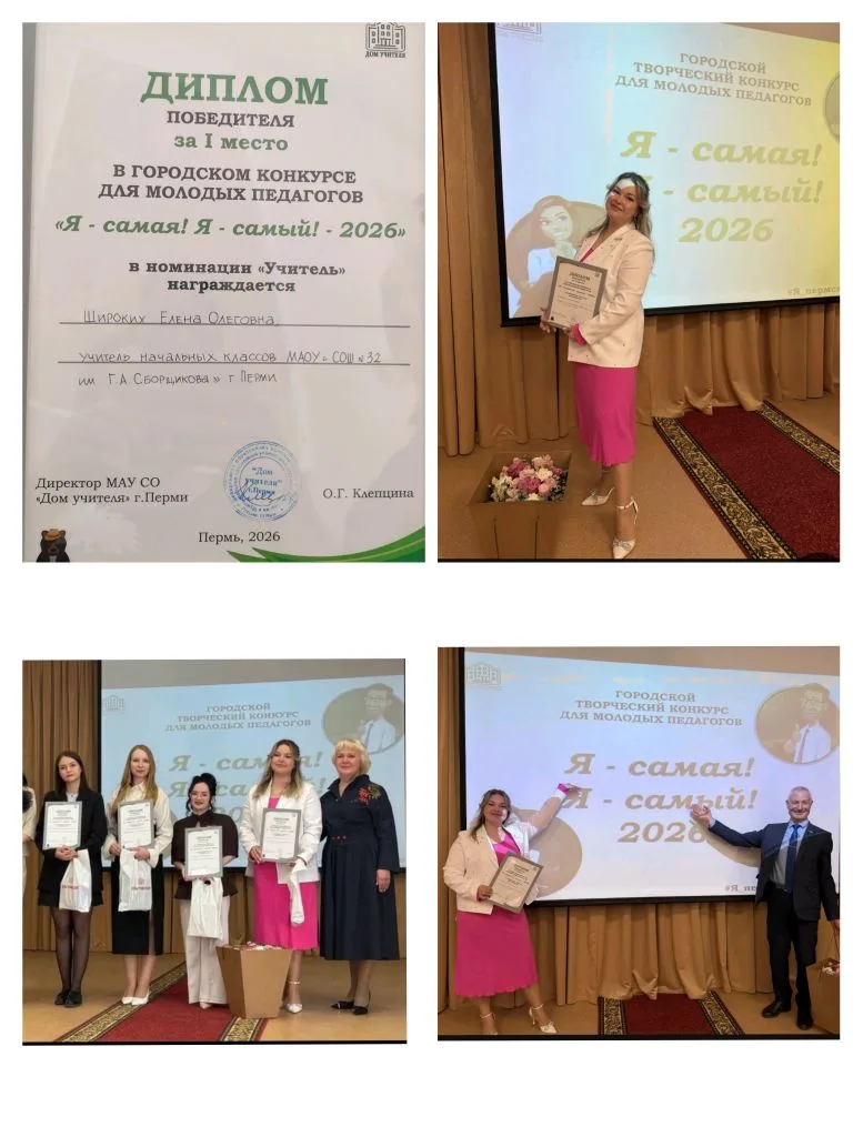 3 апреля в Доме Учителя состоялся финал городского конкурса «Я — Самая! Я — Самый!», который стал настоящим праздником профессионализма, креативности и педагогического мастерства! Конкурс направлен на профессиональное развитие молодых педагогов, помогает им укрепить уверенность в себе, выразить собственную педагогическую позицию и творческий почерк, а также повышает престиж профессии учителя. В этом году в конкурсе приняли участие более 50 молодых педагогов. По итогам заочного тура (видеовизитка «Пермский педагог») в очный этап вышли 39 участниц, которые прошли два испытания: «Педагогический лайфхак» - демонстрация своих методических находок в работе с детьми и «Хобби» - представление творческих способностей, помогающих в профессиональной деятельности. Как результат – на финальном испытании «Стильный педагог» встретились 24 молодых педагога. И вот они, итоги конкурса: 1 место в номинации «Учитель» заняла Широких Елена Олеговна, учитель начальных классов МАОУ «СОШ № 32 им. Г.А. Сборщикова». Поздравляем нашего победителя! Гордимся и желаем ей дальнейших успехов в педагогической деятельности! Мы благодарим весь коллектив школы за методическое сопровождение и поддержку Елены Олеговны! Вместе – мы сила!