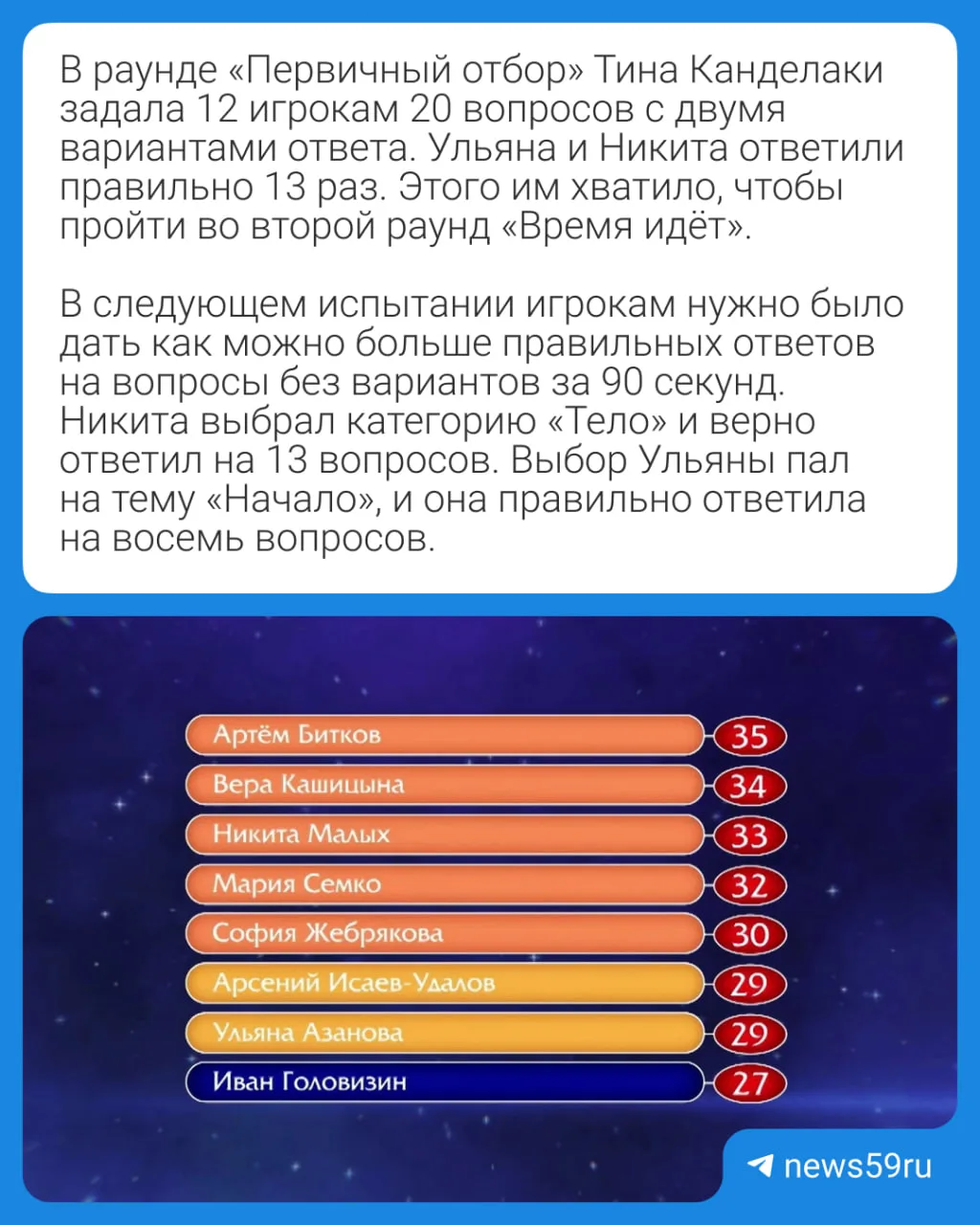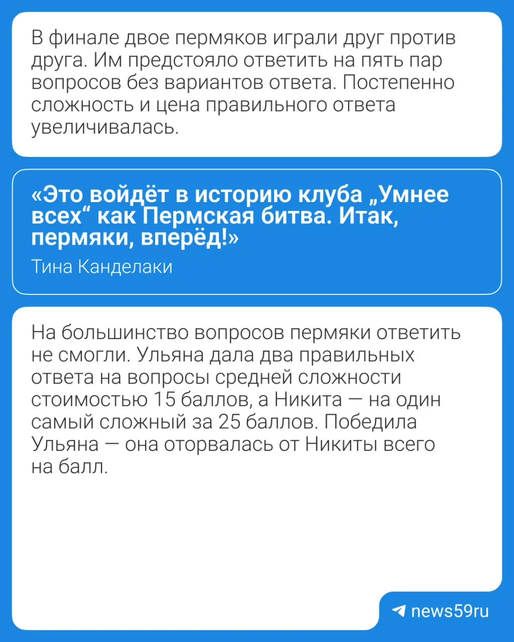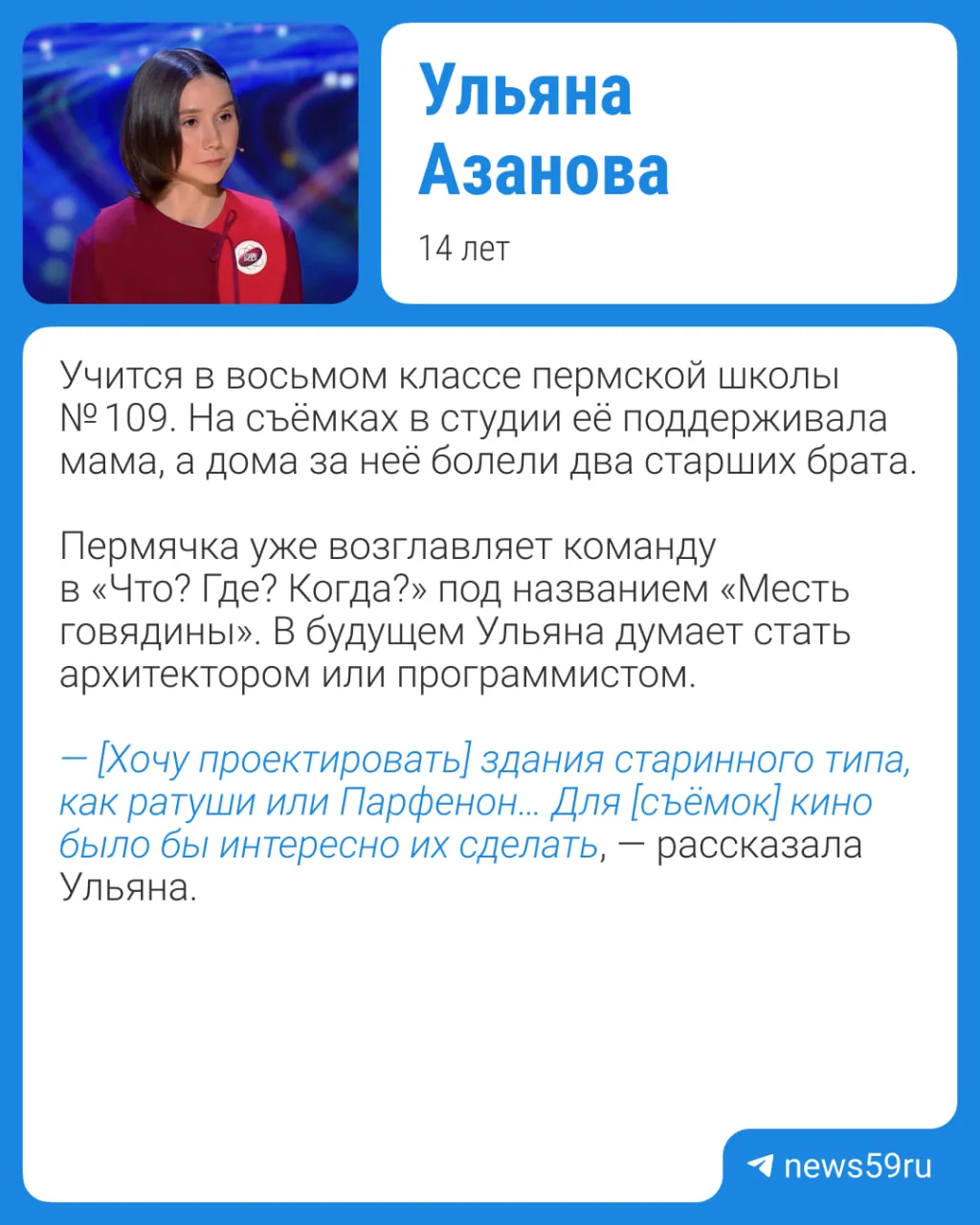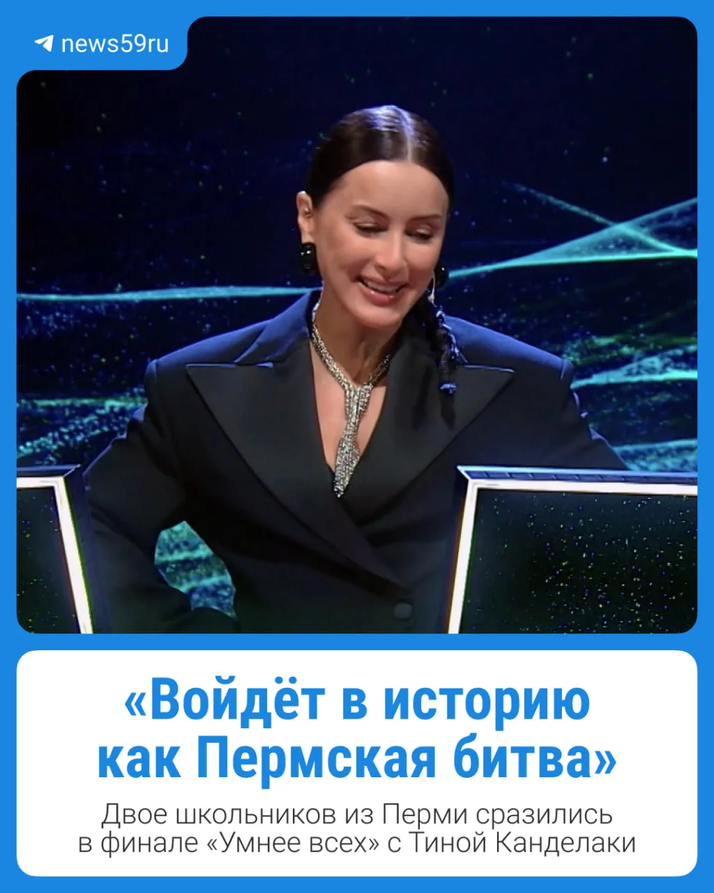 Пермские школьники приняли участие в телеигре «Умнее всех» (12+). Программу с ними показали вечером 2 апреля. Ведущая Тина Канделаки назвала их игру Пермской битвой.