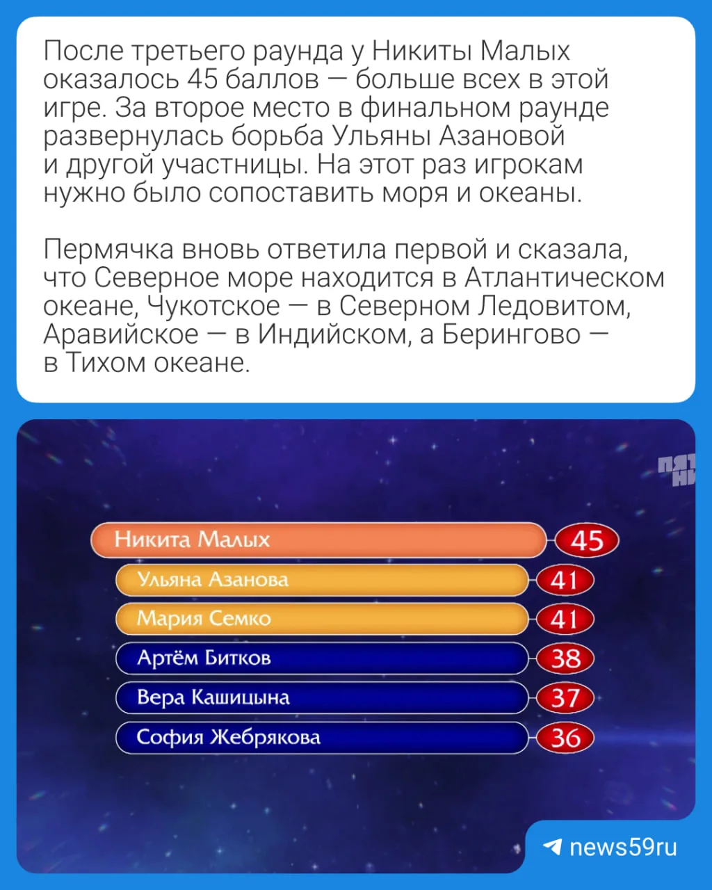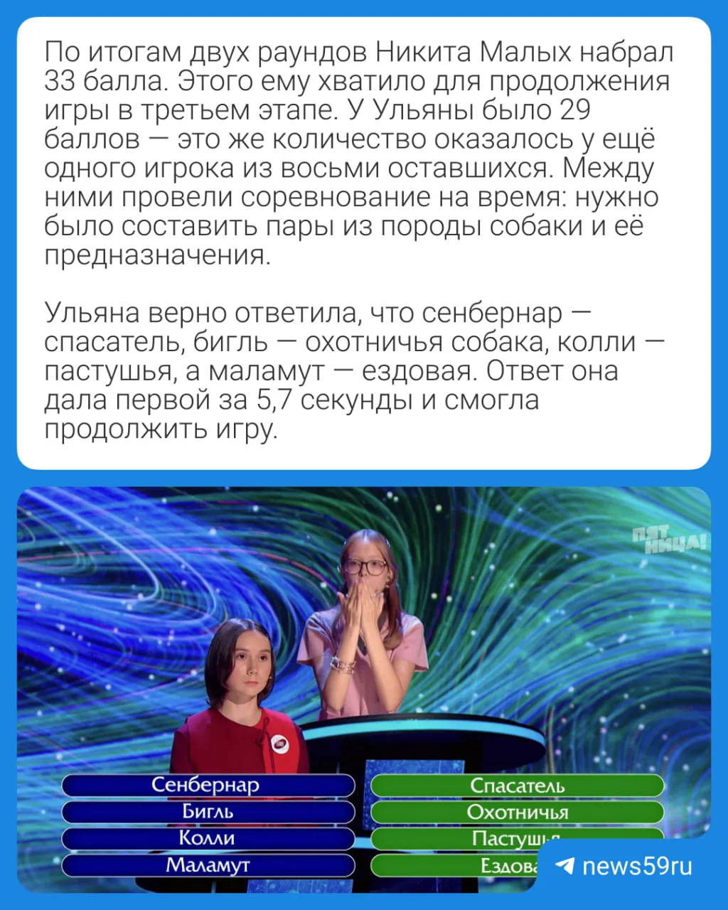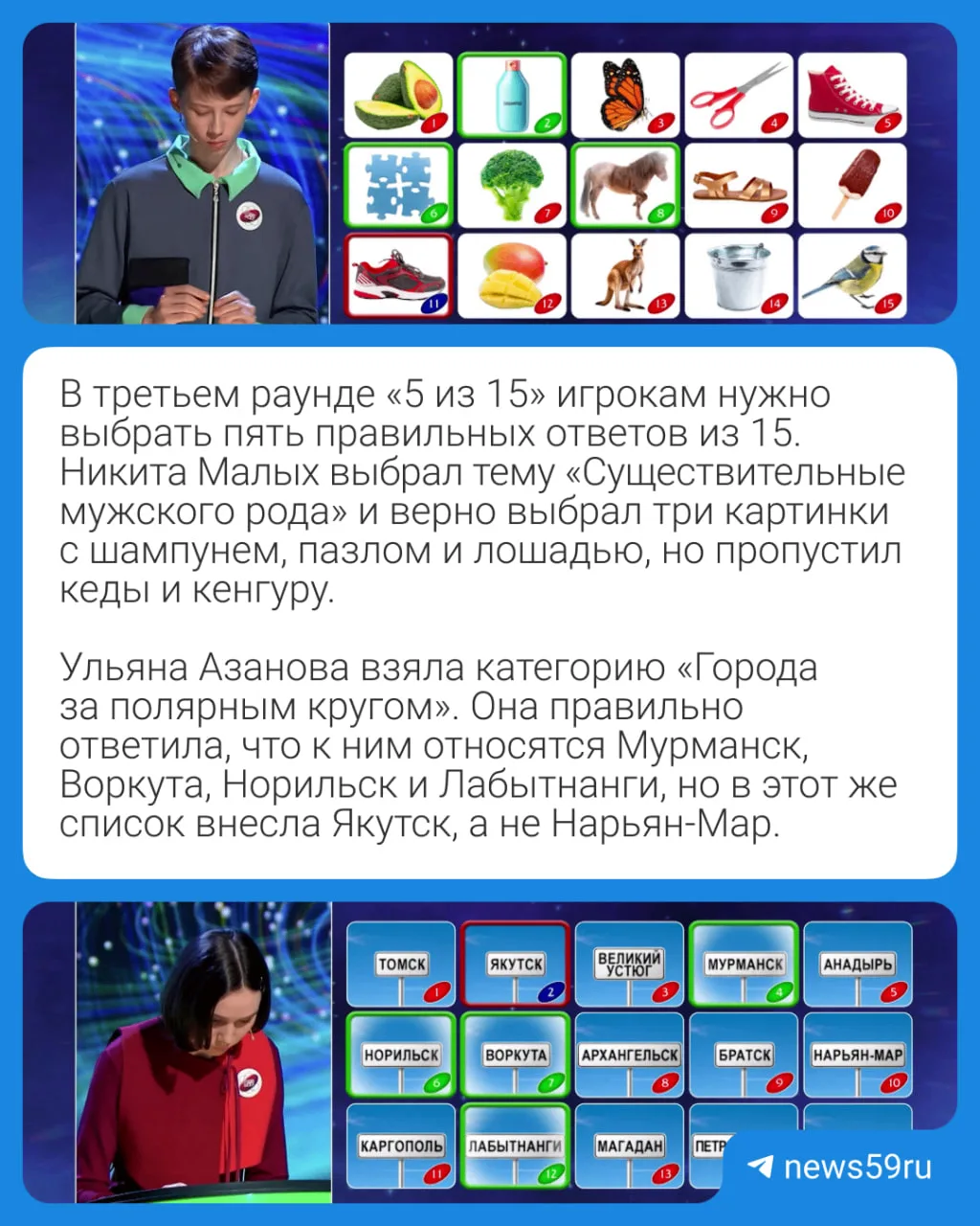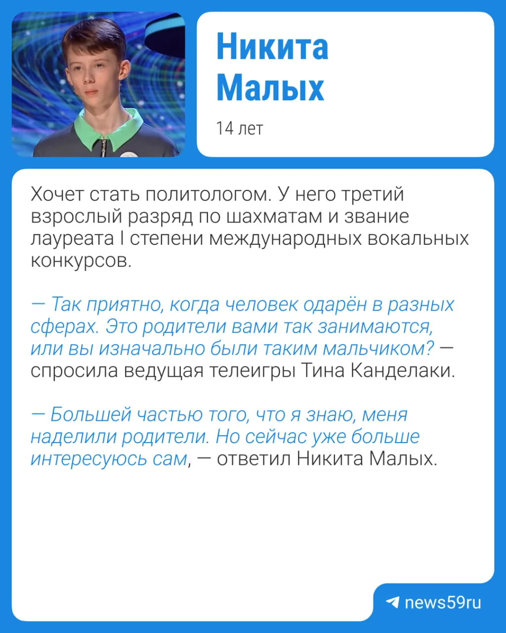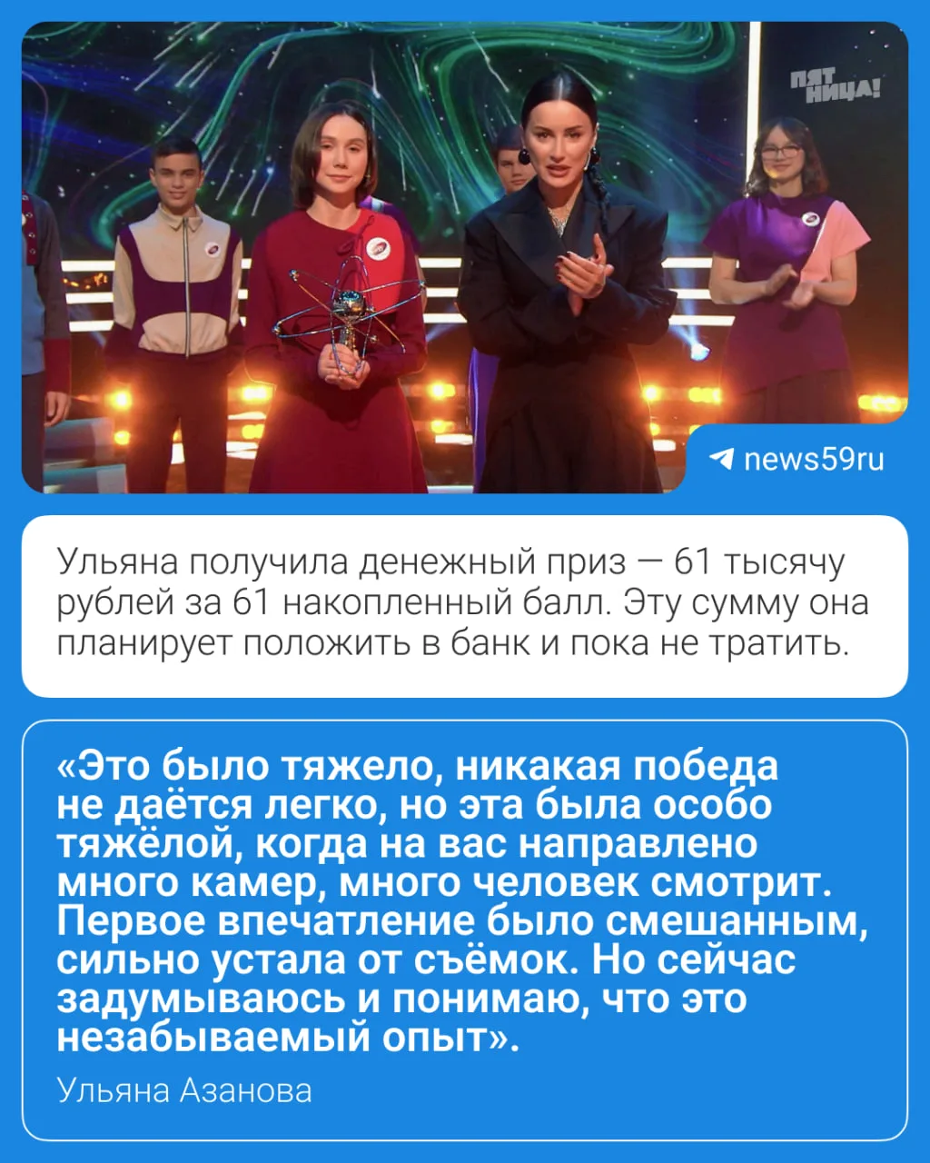 Пермские школьники приняли участие в телеигре «Умнее всех» (12+). Программу с ними показали вечером 2 апреля. Ведущая Тина Канделаки назвала их игру Пермской битвой.